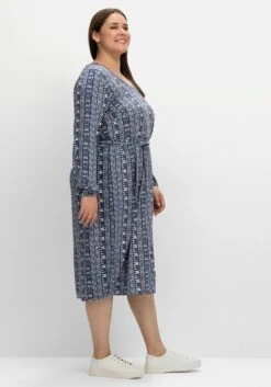 Kleid aus Viskosejersey von sheego by Joe Browns. Charakteristisch sind hier der charmante Blumendruck und der tiefe, herzförmige Ausschnitt. Das Kleid hat kurze Ärmel, die Taillennaht definiert die Silhouette. Darunter schließt sich das leicht ausgestellte und weit schwingende Rockteil an.