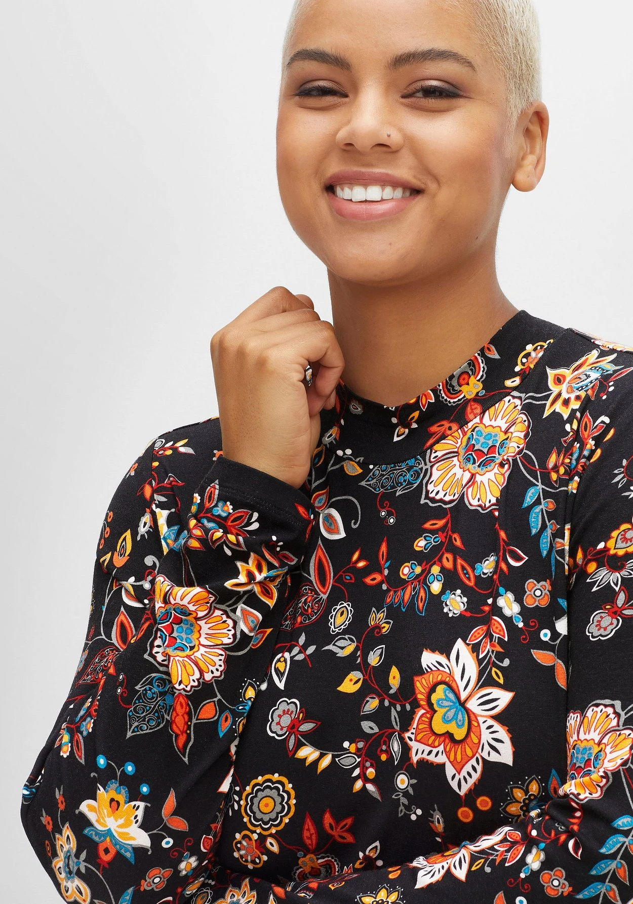 Jerseykleid in Midilänge von sheego by Joe Browns. Für den romantischen Look sorgt das wunderschöne Allover-Blumenmuster in Kombination mit der femininen Passform. Der halsnahe Stehkragen gibt dem Style Modernität, die leicht gekräuselte elastische Taillennaht betont geschickt die weibliche Silhouette. Darunter schließt sich ein weit schwingende Rock an, der durch den Volant am Saum seinen verspielten Abschluss findet.