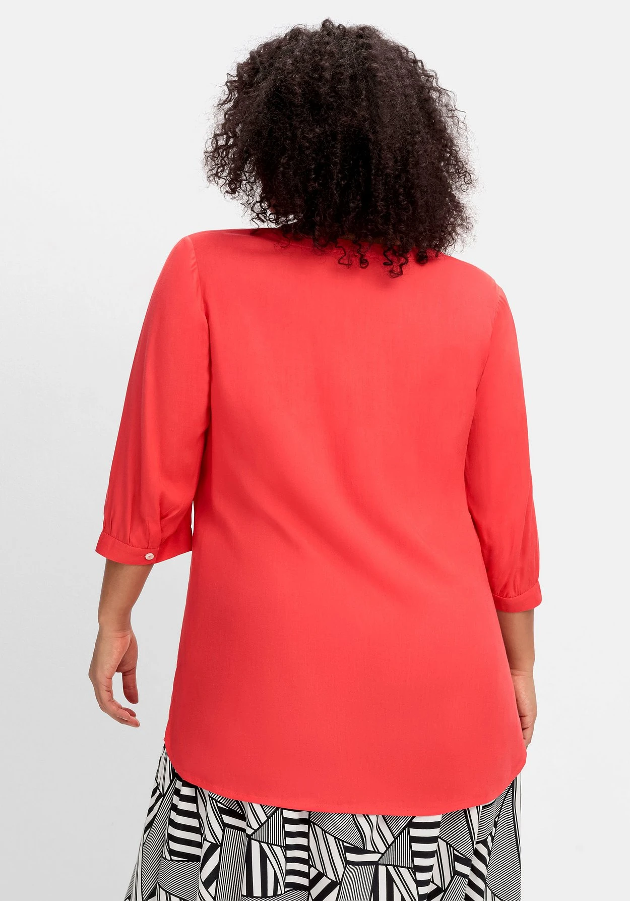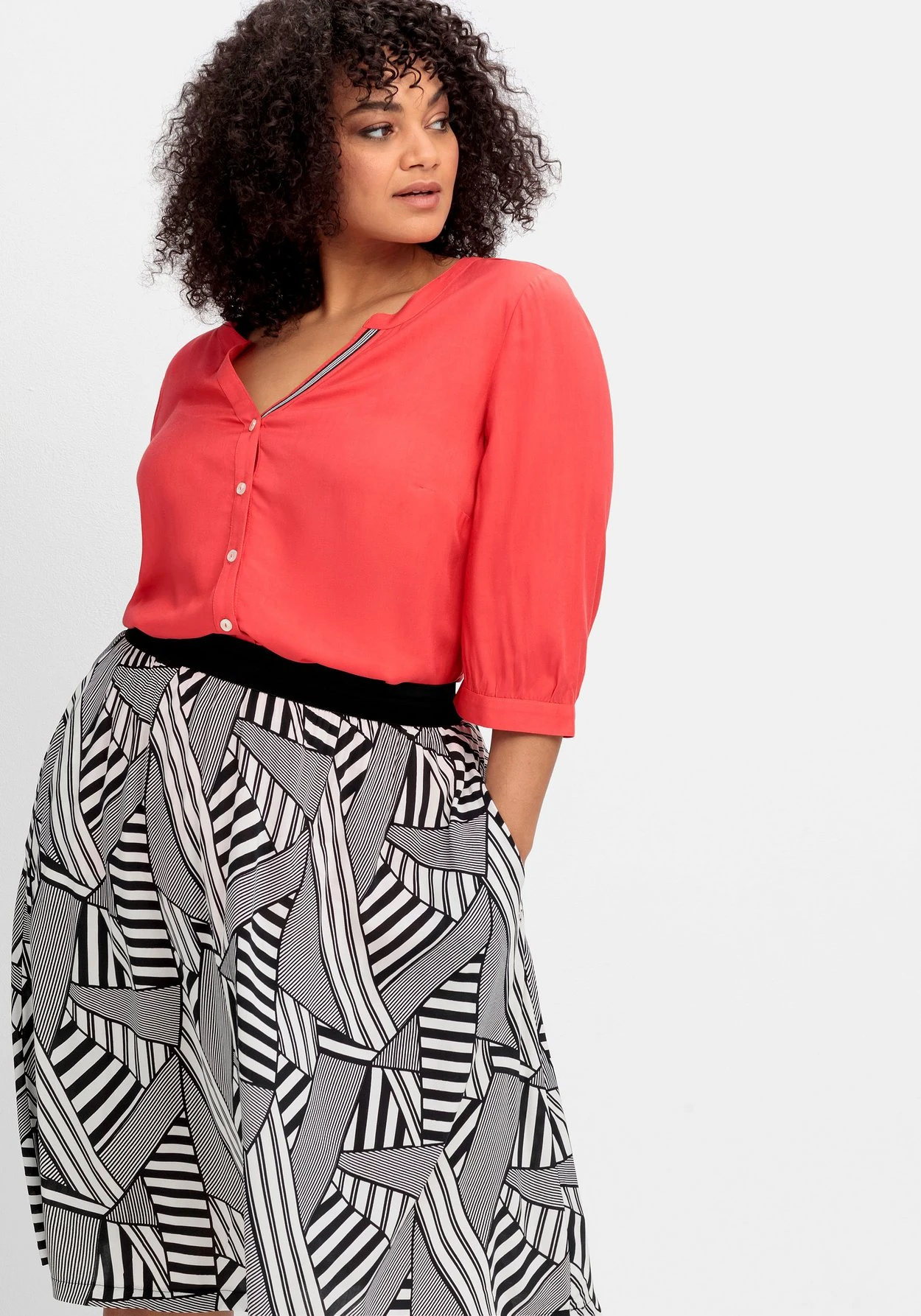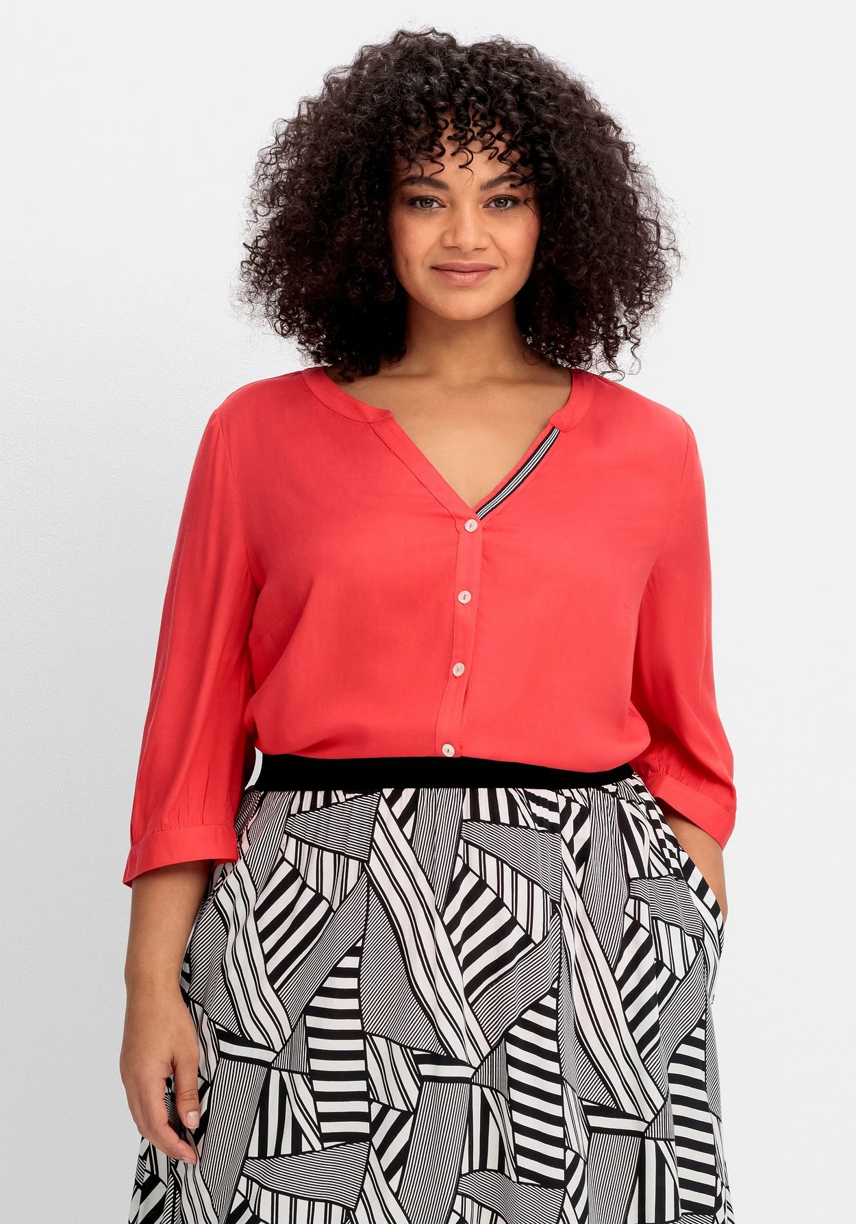 Bluse mit 3/4-Arm. Der Rundhals geht in V-Ausschnitt und Knopfleiste über, das seitliche Ziertape am Ausschnitt ist dabei ein sportives Finish. Die 3/4-Ärmel enden mit gepflegten Manschetten und Knopfverschluss. Das verlängerte Rückenteil schmeichelt der Po-Partie, die seitlichen Schlitze lassen das Oberteil locker über die Hüfte fallen.