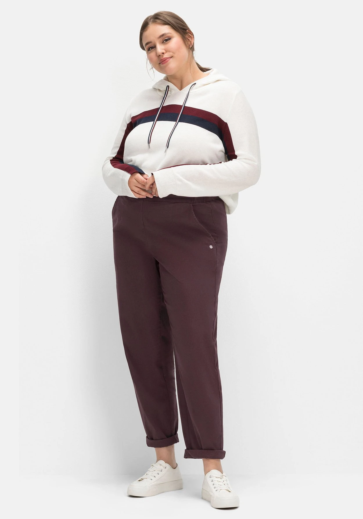 Twillhose im Chino-Schnitt. Der unkomplizierte Look ist in Schlupfform mit bequemem Teilgummibund hinten gearbeitet. Zu den beiden Eingrifftaschen vorn kommen zwei Leistentaschen hinten. Mehr Lässigkeit erhält der Look mit hochgekrempelten Hosenbeinen und wird wirkungsvoll betont.
