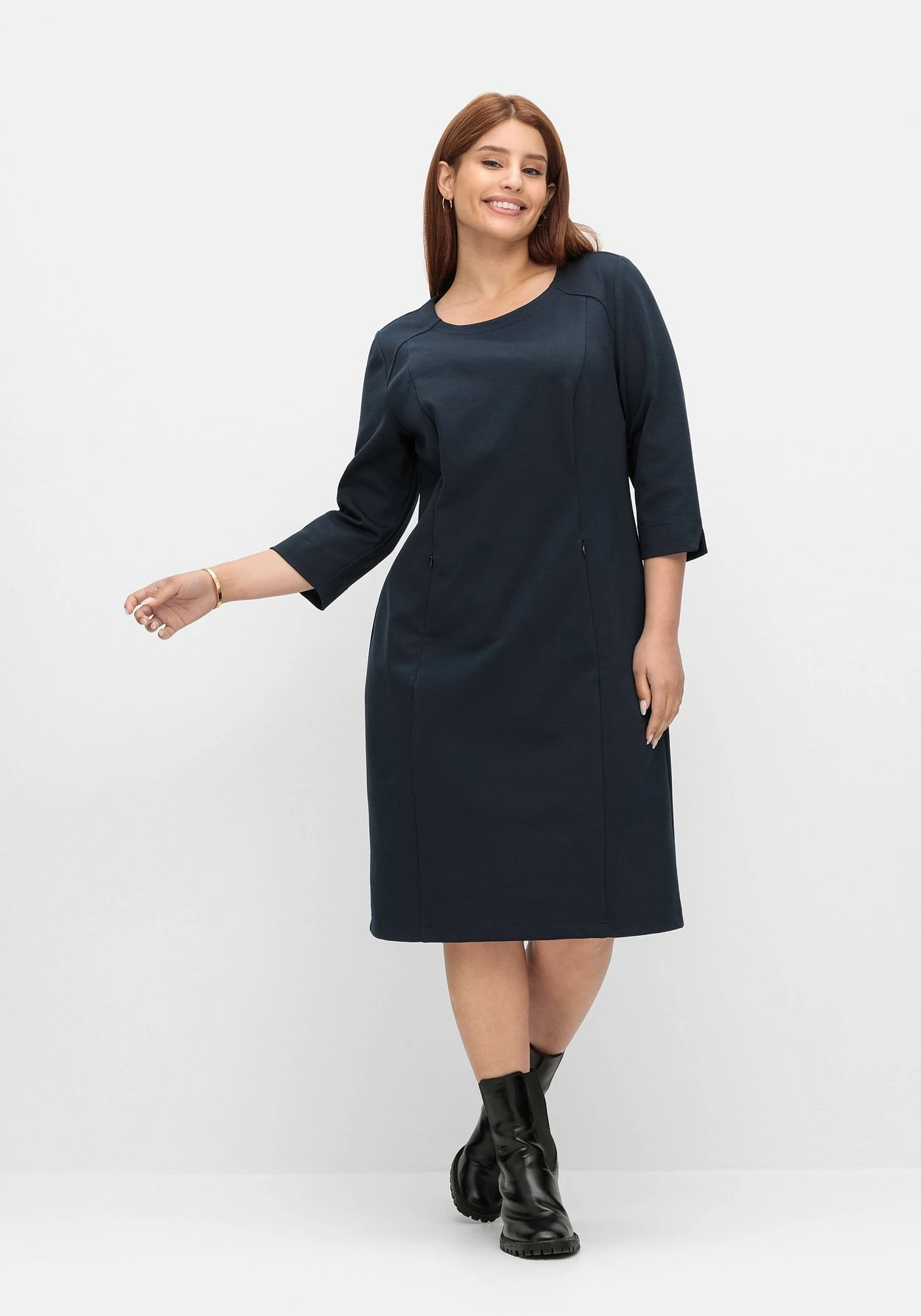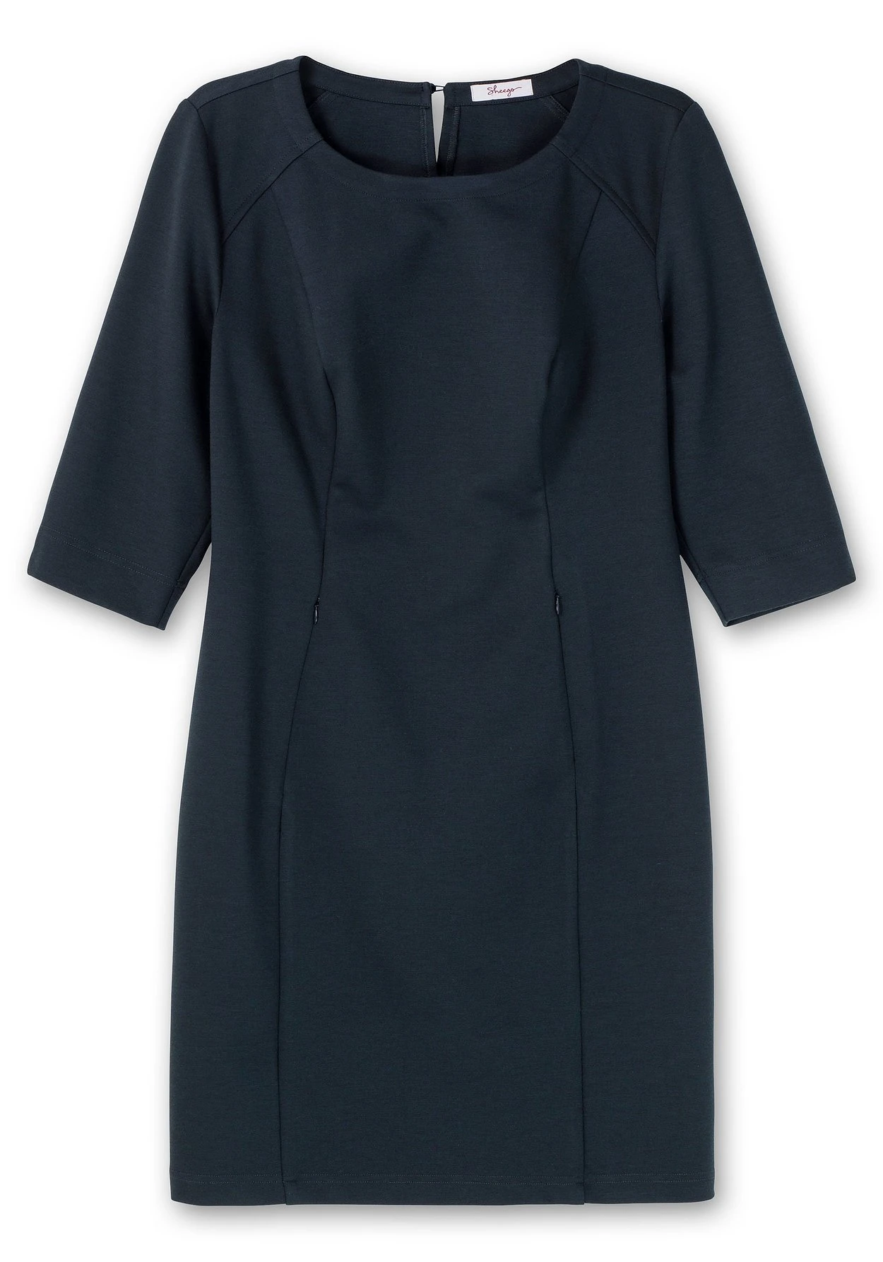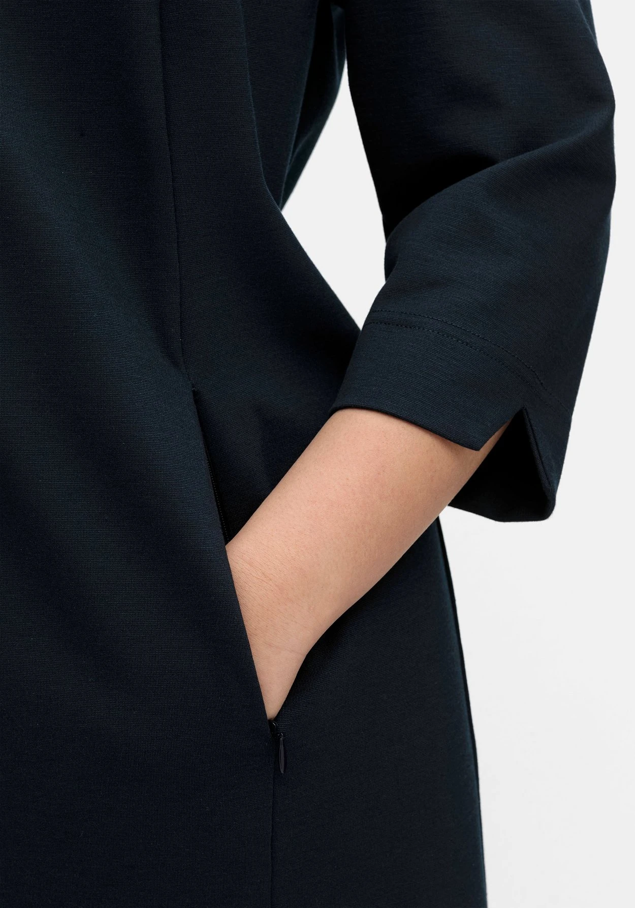 Etuikleid in Petite-Passform. Das figurbetonte Kleid überzeugt mit klassischem Schnitt und 3/4-langen Ärmeln. In die Naht vorn sind Eingrifftaschen mit dekorativem Reißverschluss eingearbeitet, im Nacken überrascht ein Schlitz mit Knopf. Geschickt gesetzte Teilungsnähte formen eine schmeichelnde Silhouette.