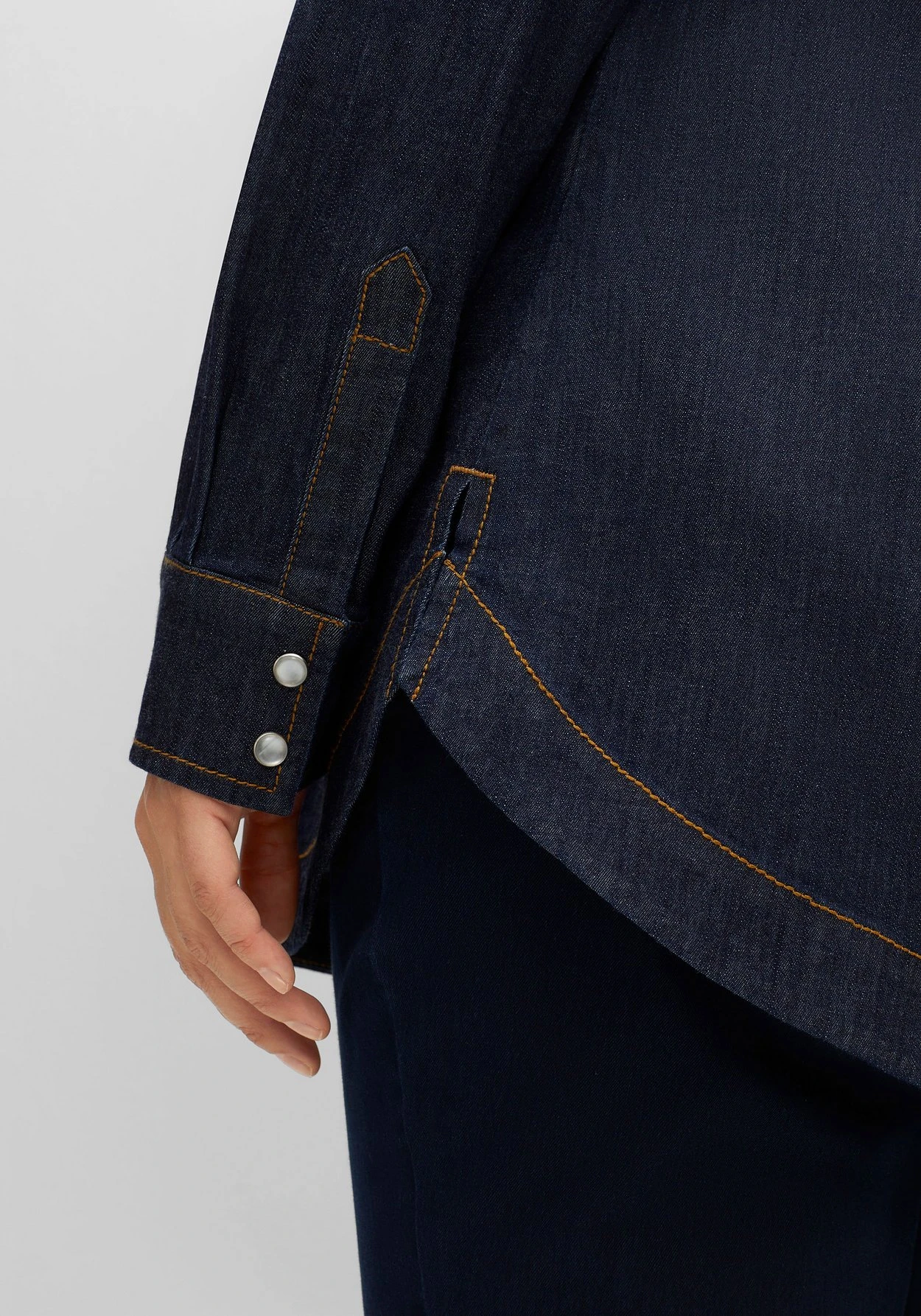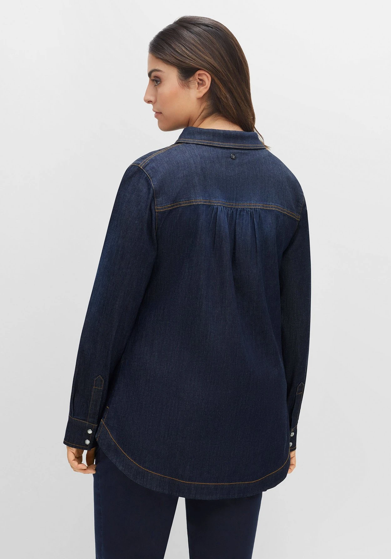 Jeanshemd mit Druckknöpfen. Für den kernigen Cowgirls-Look sorgen die auffälligen Nähte in Kontrastfarbe. Vorn dient die Sattelsteppung als Eyecatcher, hinten wird eine angekräuselte Passe zum femininen Detail. Die Ärmel sind mit Manschetten und zwei Druckknöpfen gearbeitet, der abgerundete Saum erhält durch die Seitenschlitze noch mehr Bewegungsfreiheit.