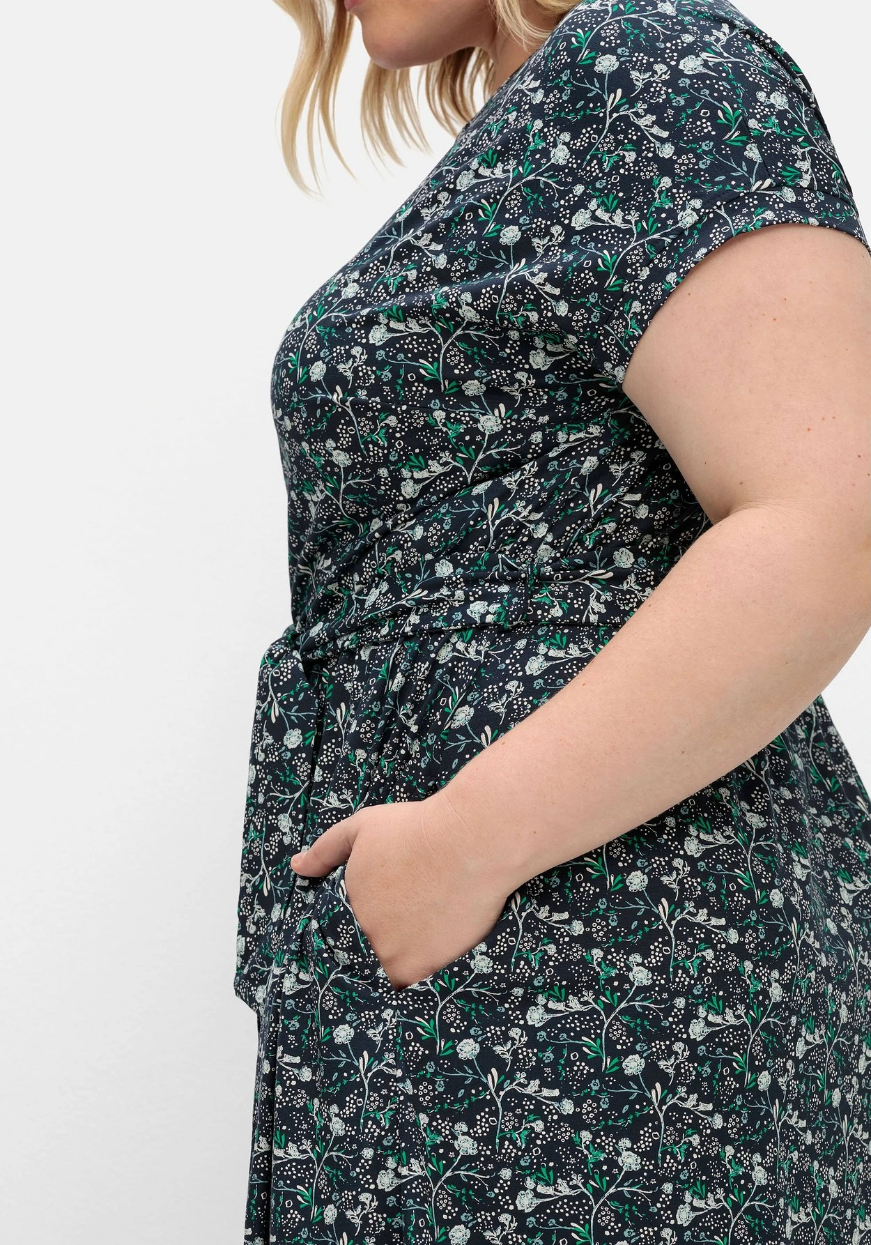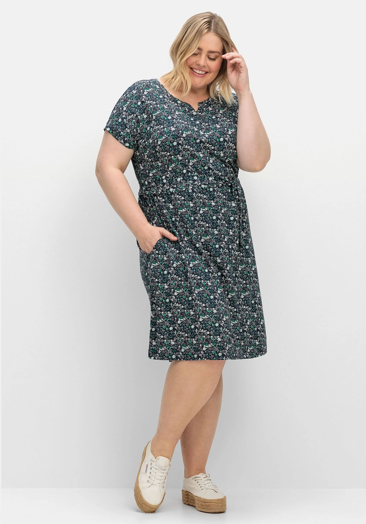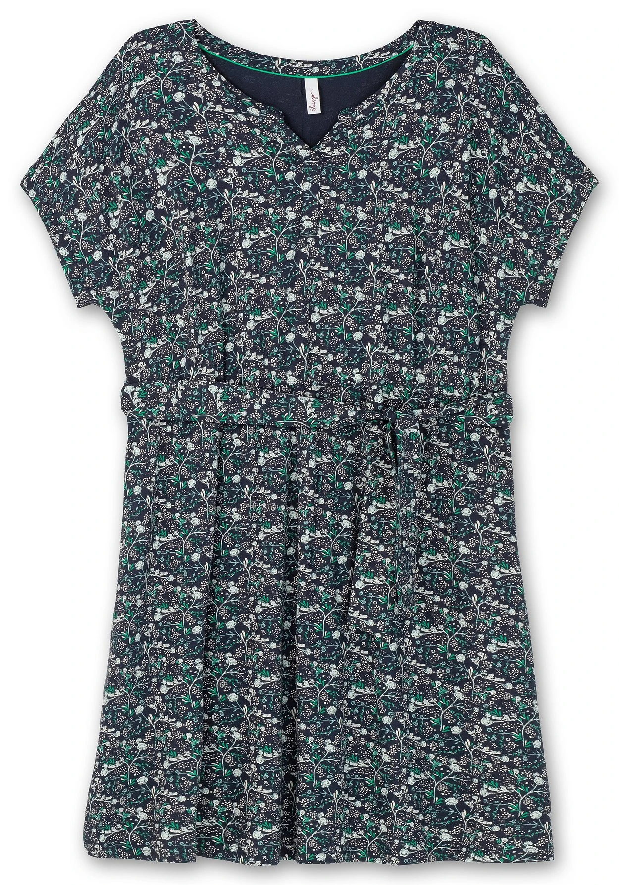 Jerseykleid mit Blumenprint. Das kurze Kleid besitzt einen bequemen Gummizugbund in der Taille, der Bindegürtel betont die Körpermitte zusätzlich. Für eine gepflegte Optik sorgen die Blenden an Ärmelsaum und Rundhalsausschnitt, der V-Cut am Ausschnitt ist mit einer Zierleiste gearbeitet. Die überschnittenen Schultern gehen in kurze Ärmel über. Eingrifftaschen in der Seitennaht sind eine praktische Ergänzung.
