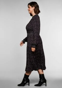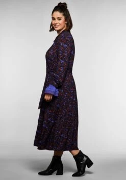 Jerseykleid in kniefreier Länge. Zum Alloverdruck setzt der unifarbene Bluseneinsatz einen modischen Kontrast. Der herzförmige Ausschnitt, der in eine kurze Knopfleiste übergeht, ist dazu eine feminine Ergänzung. Durch den Gummizugbund am Abschluss bekommt der lange Ärmel ein verspieltes Finish.