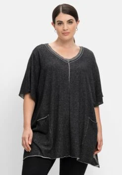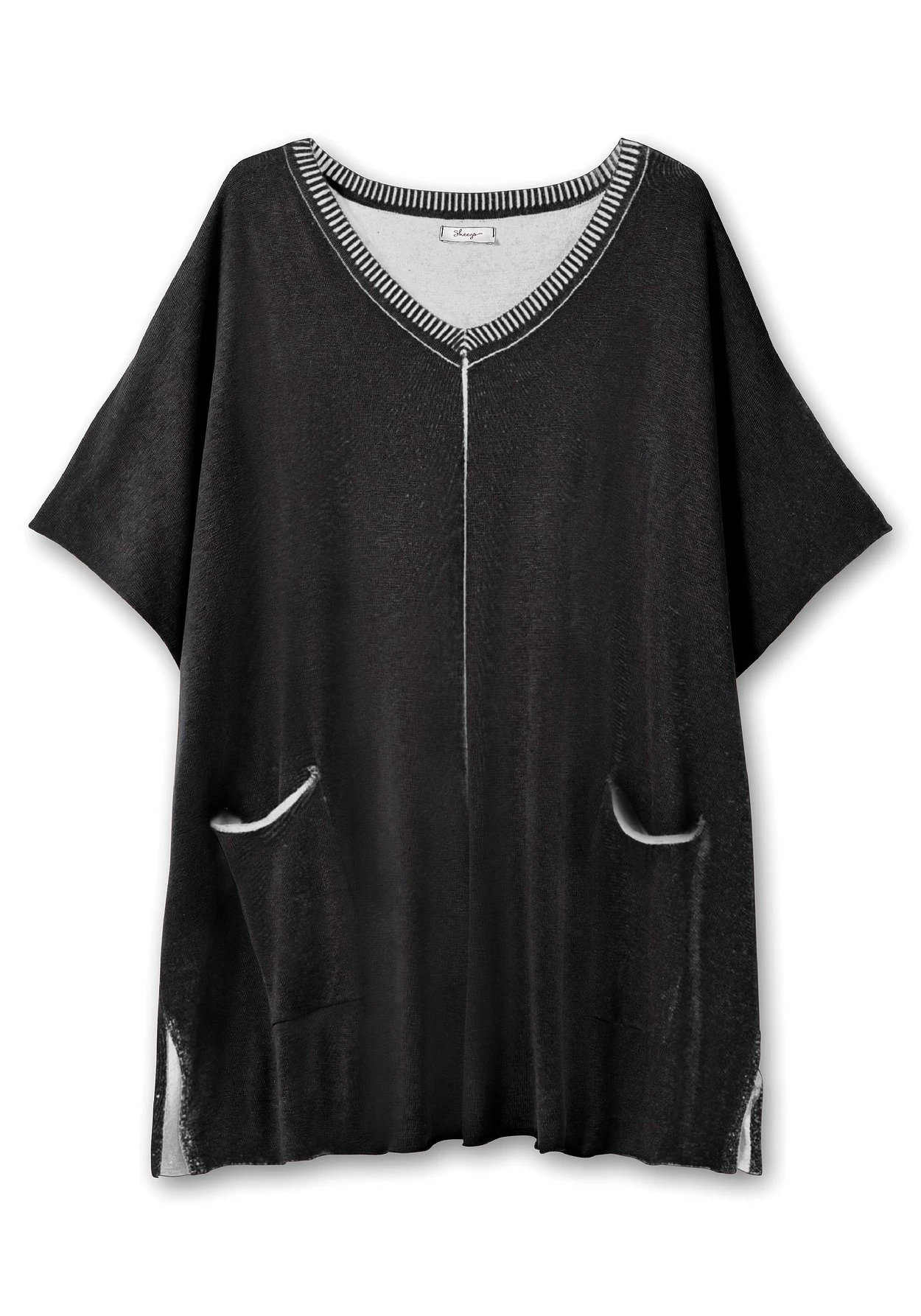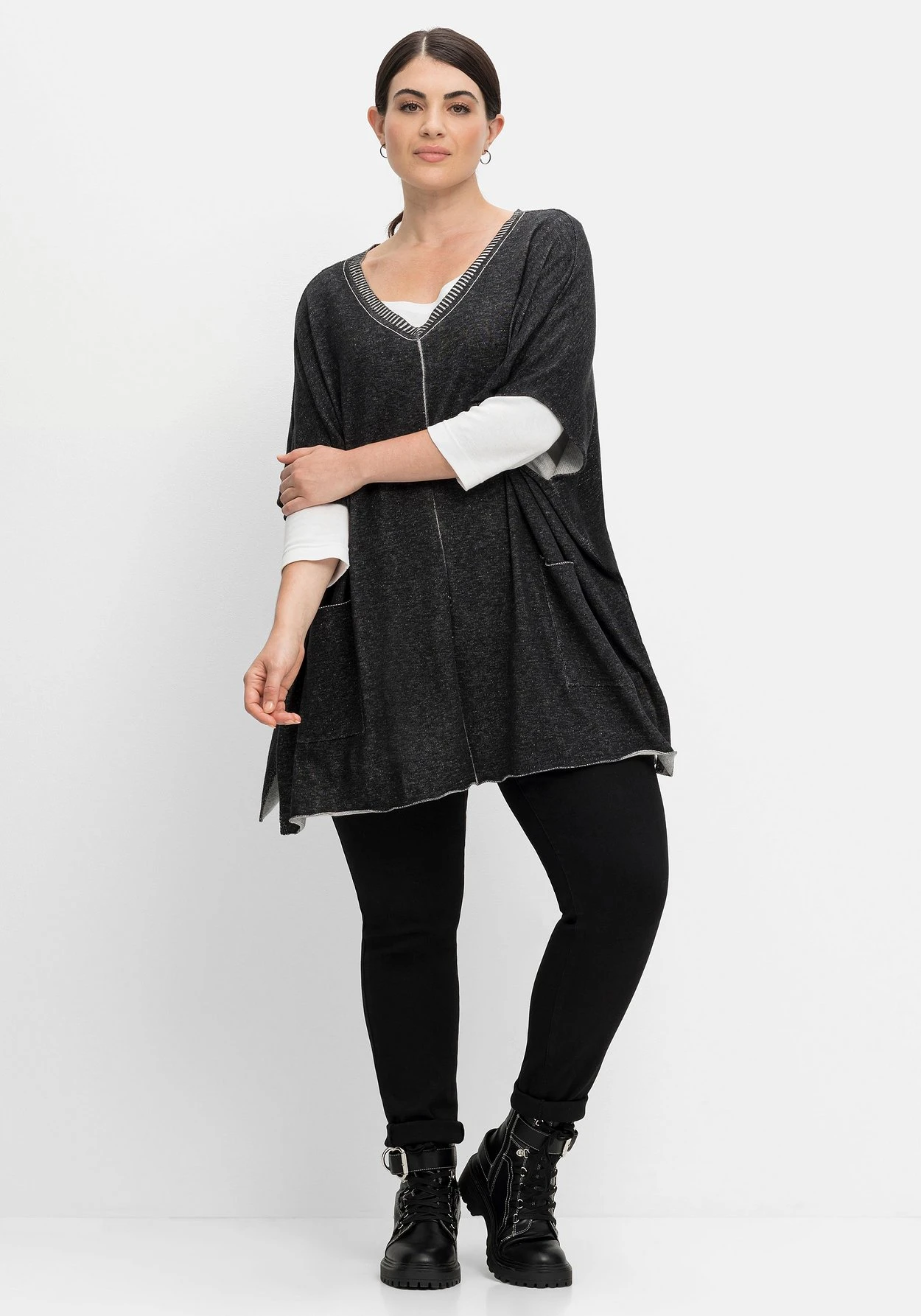 Der Oversize-Schnitt fällt locker über die Figur. Der V-Ausschnitt streckt den Oberkörper, auch der Kontraststreifen unterstreicht den Effekt gekonnt. So betont er besonders die V-Figur.