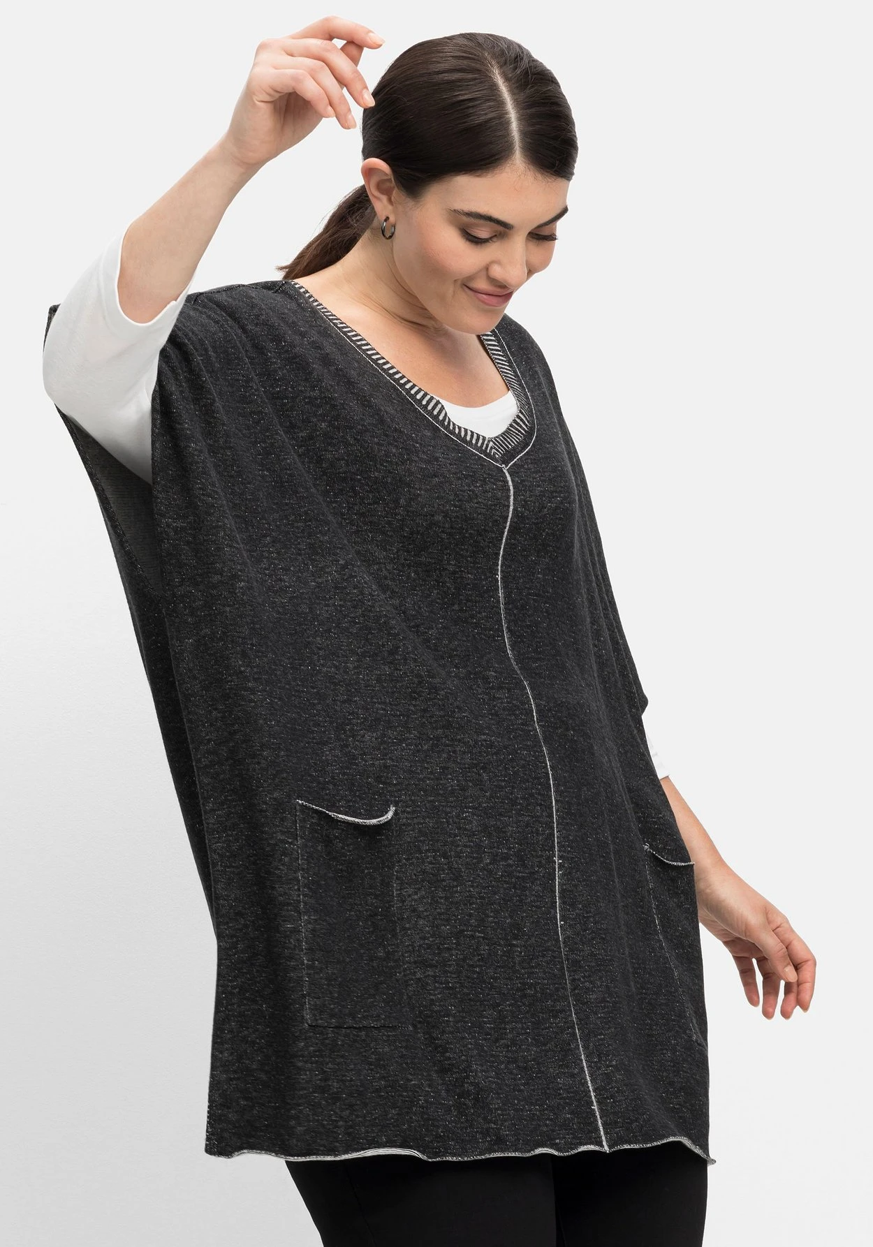 Kurzarmpullover mit überschnittenen Schultern. Durch den zweifarbigen Strick und den schmalen Kontraststreifen vorn erhält er seinen besonderen Look. Der V-Ausschnitt und die beiden aufgesetzten Taschen ergänzen den modischen Auftritt. Seitenschlitze im Saum geben noch mehr Bewegungsfreiheit.