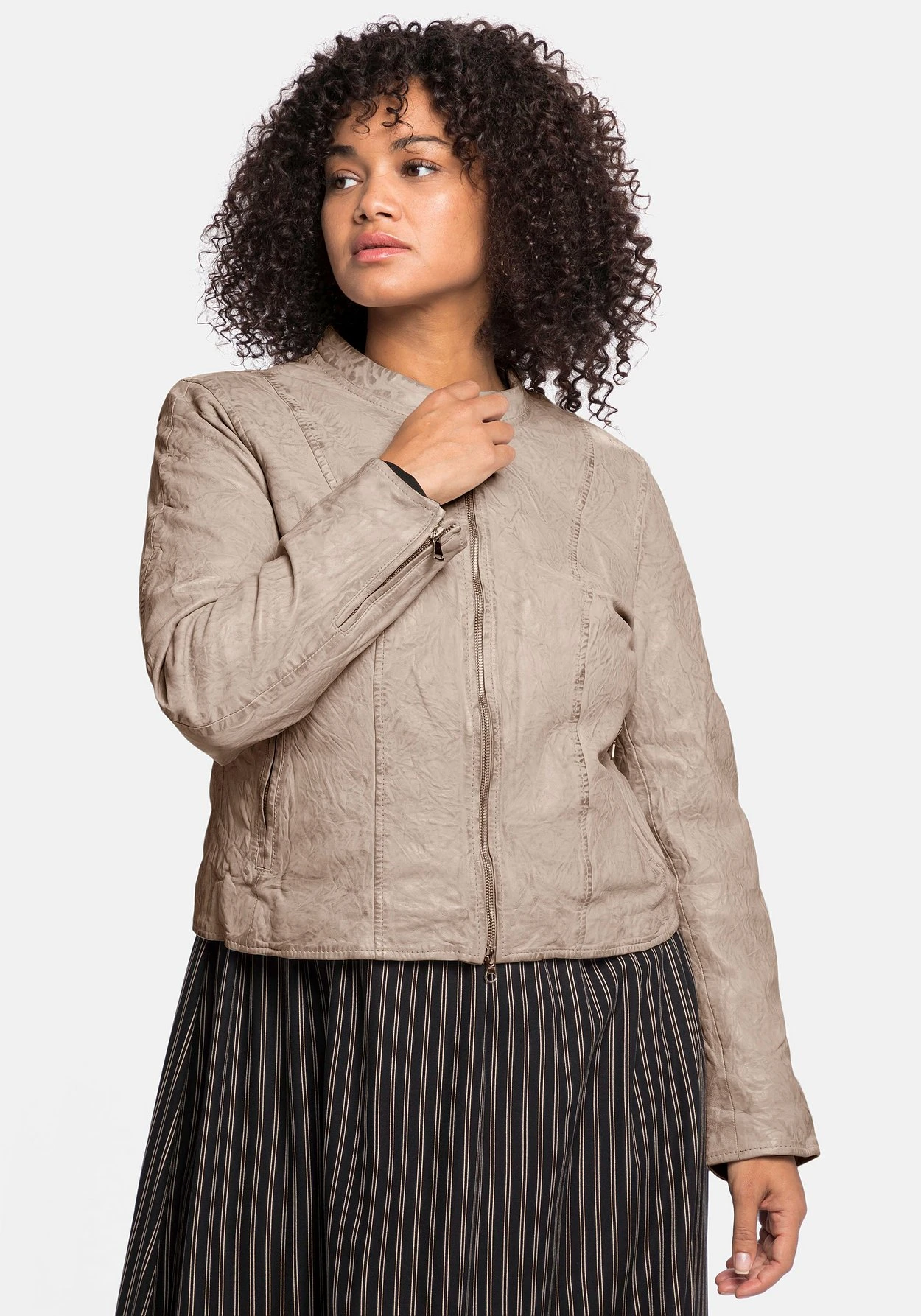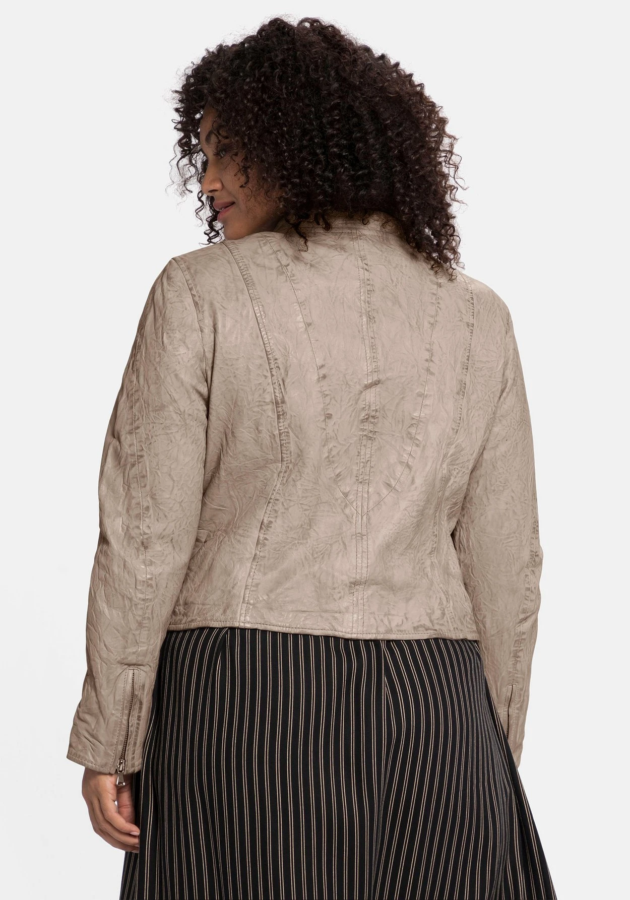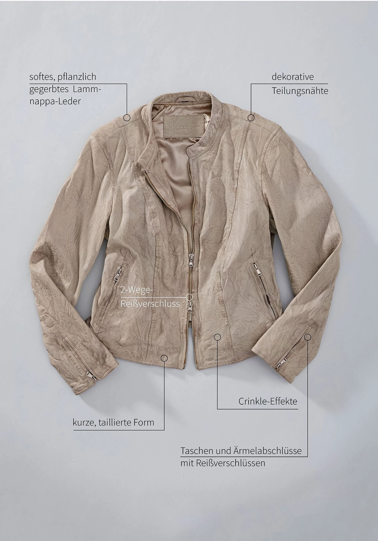 Hochwertige Lederjacke aus Lammnappa. Edel in der Verarbeitung zeigt sie sich mit dekorativem Crinkle-Effekt. Ein Stehkragen, die seitlichen Reißverschlusstaschen, der 2-Wege-Reißverschluss vorn sowie die Zipper-Ärmelabschlüsse geben der Jacke ein sportives Finish. Dekorative Teilungsnähte vorn und hinten sorgen für eine optimal Passform, die angesagte Kurzform bringt Modernität in den Style.