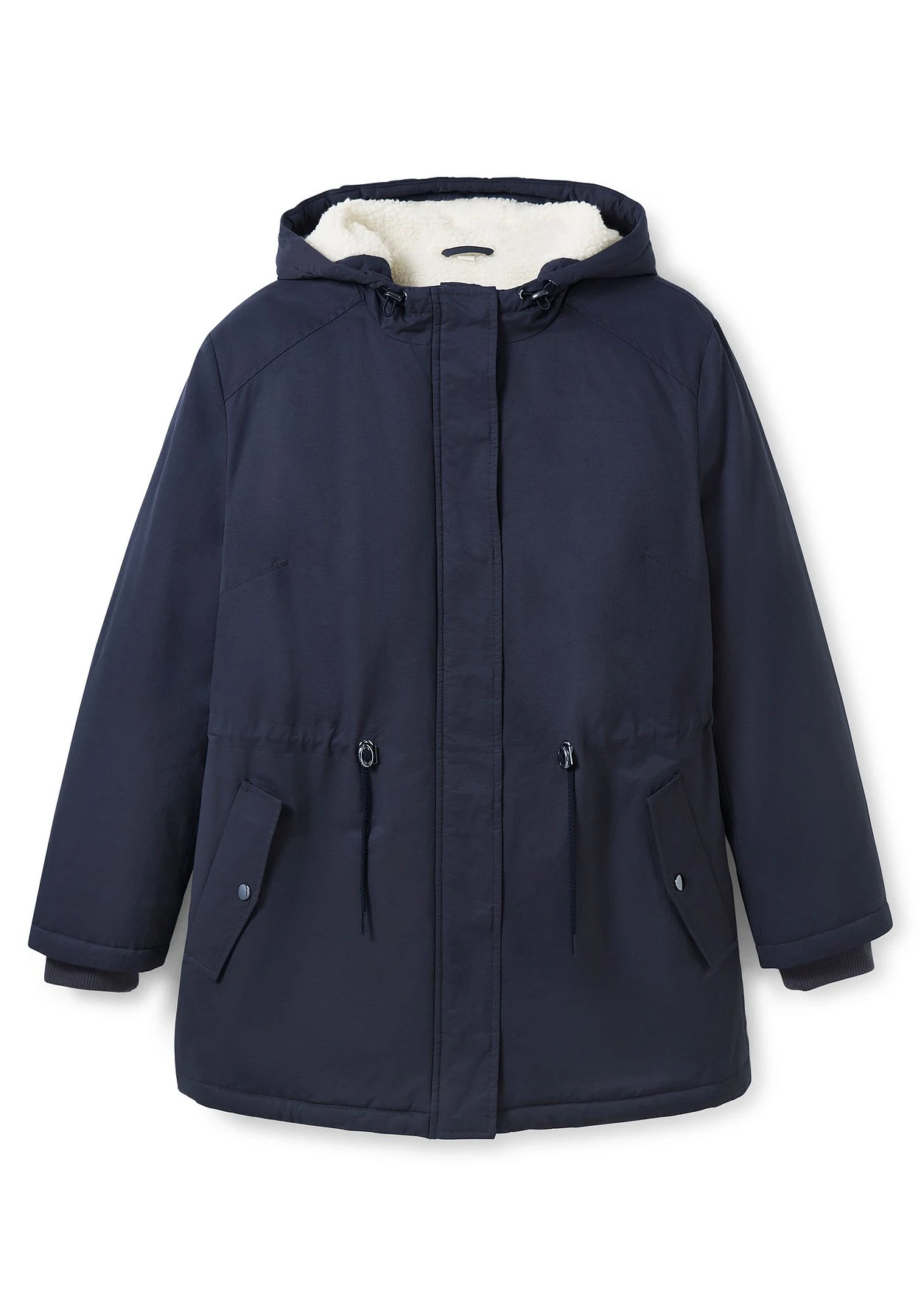 Parka in Longform. Das flauschige Teddyfutter im Bodybereich sowie an der Innenseite der Kapuze hält schön warm und setzt sich kontraststark ab. Bequeme Rippbündchen am Ärmelsaum halten optimal die Körperwärme und wärmen gleichzeitig die Handgelenke. Durch den variablen Tunnelzug kann die Jacke entweder locker entspannt oder feminin auf Taille getragen werden. Besonders praktisch ist der 2-Wege-Zipper mit verdeckter Druckknopfleiste, dekorativ zeigen sich die Eingrifftaschen mit Patte und Druckknopf.