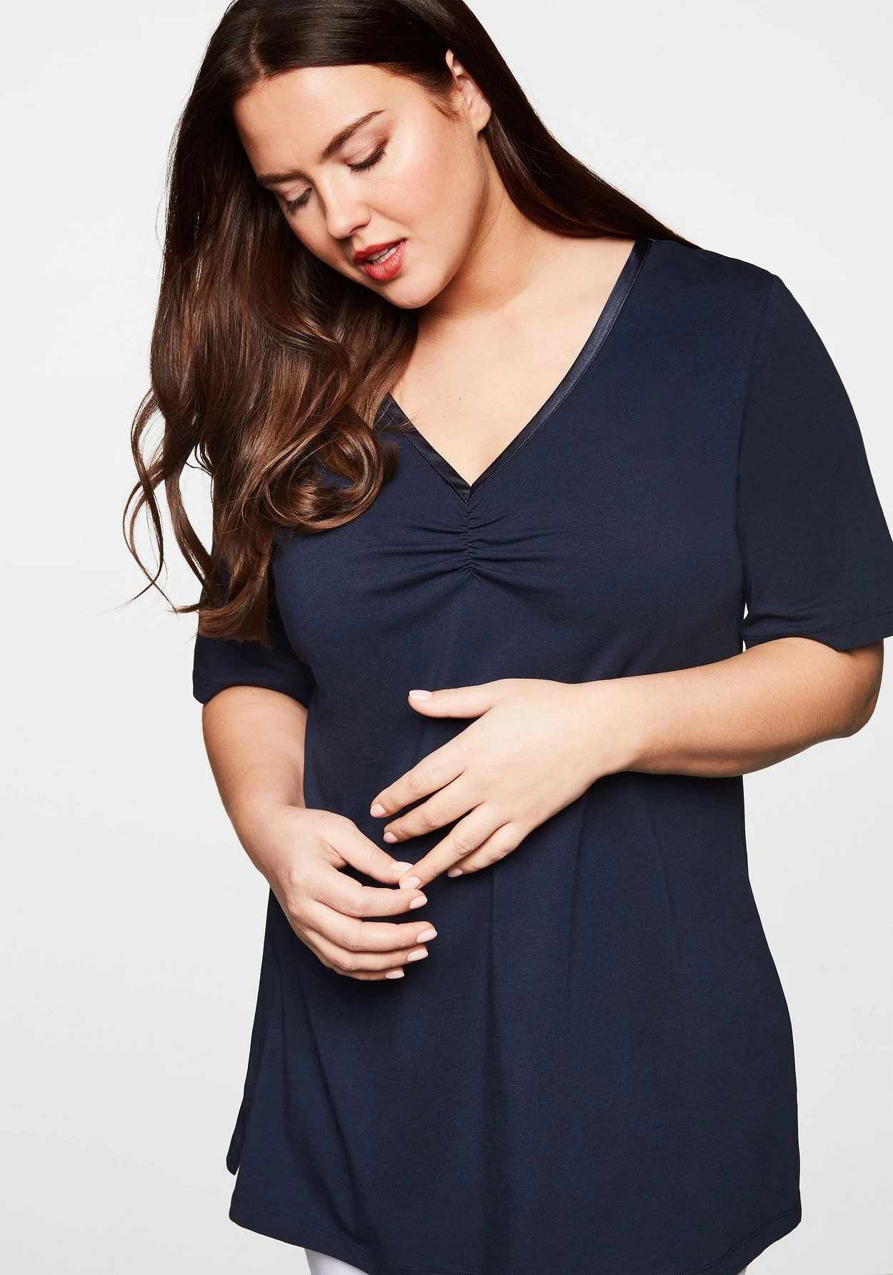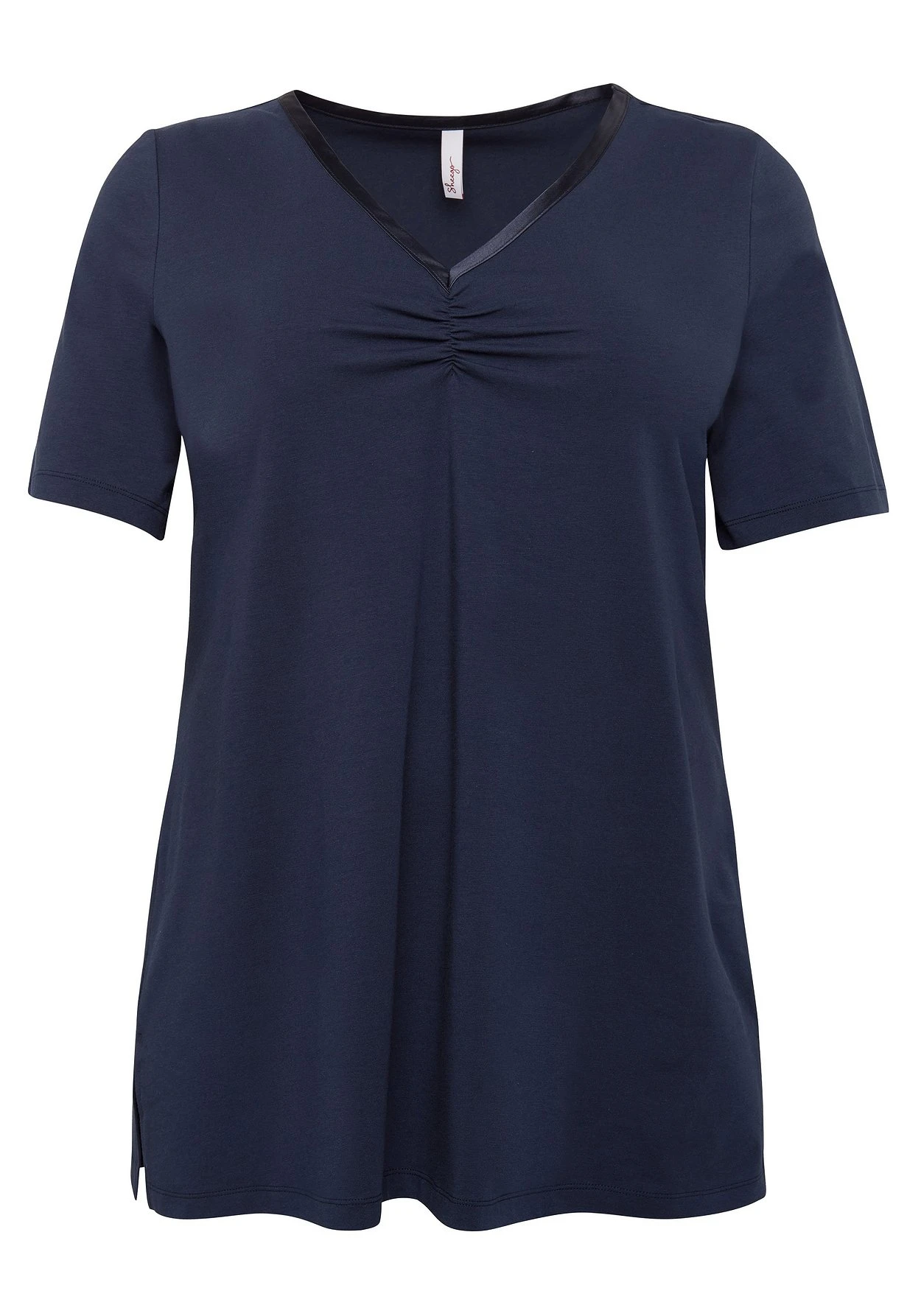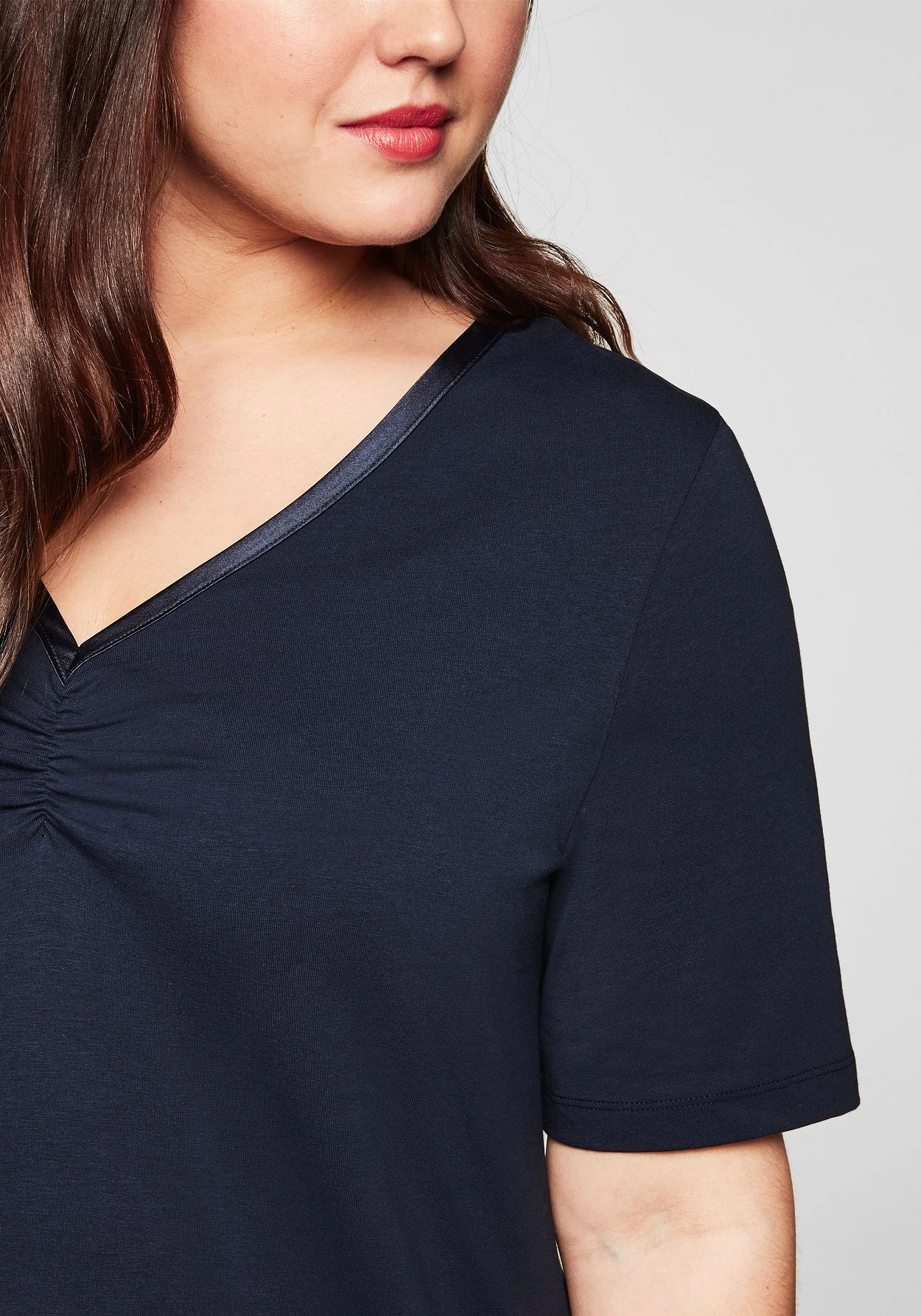 Longshirt mit längeren Halbarmen. Am V-Ausschnitt setzt ein Satinband dekorative Akzente. Seitlich befinden sich Schlitze, die für mehr Bequemlichkeit sorgen. Ein unverzichtbares Basic, das dich durch viele Saison begleitet!