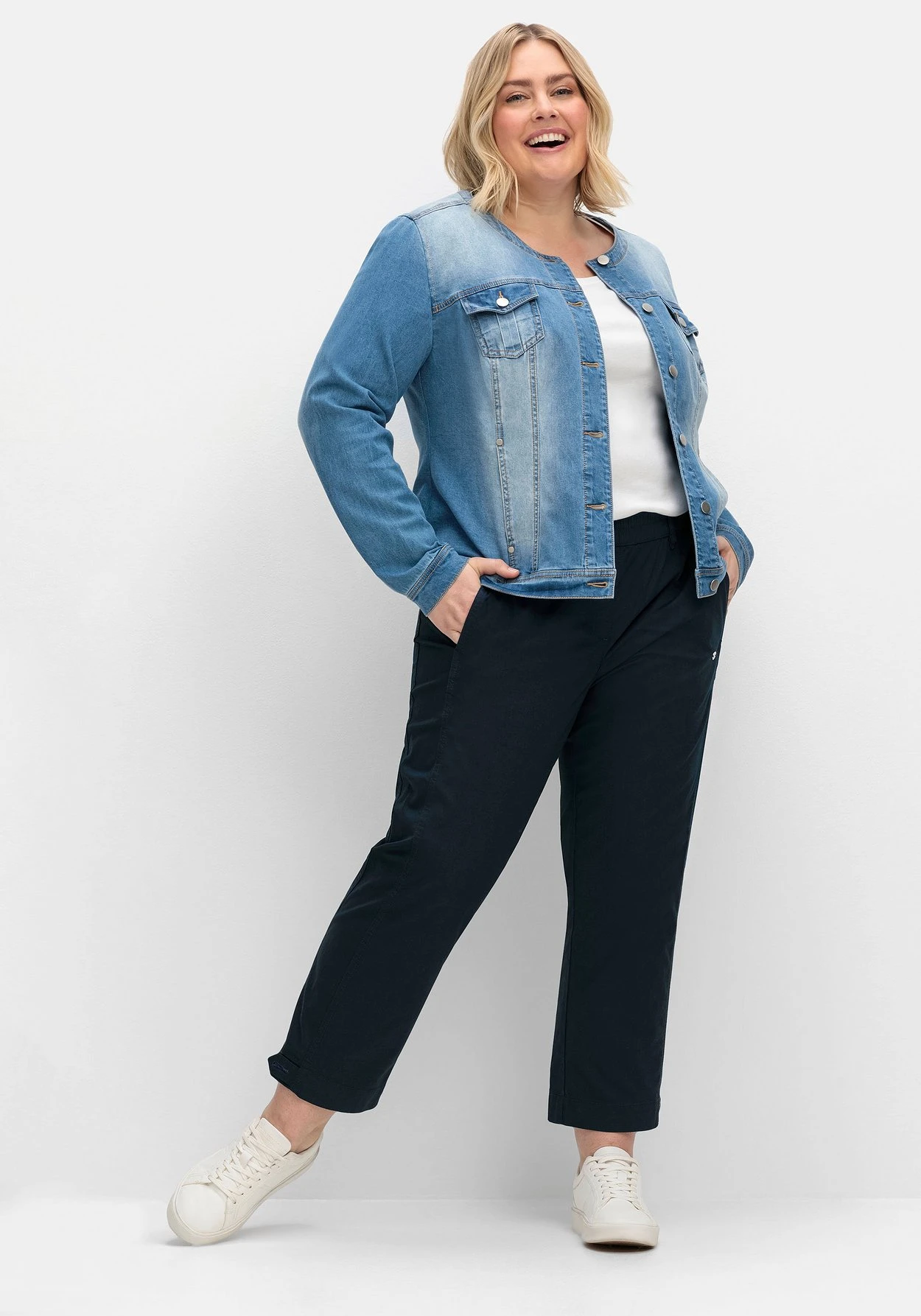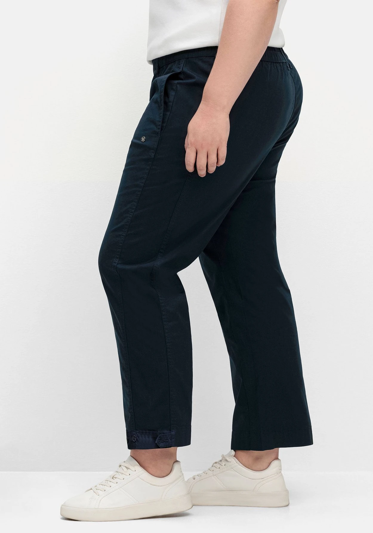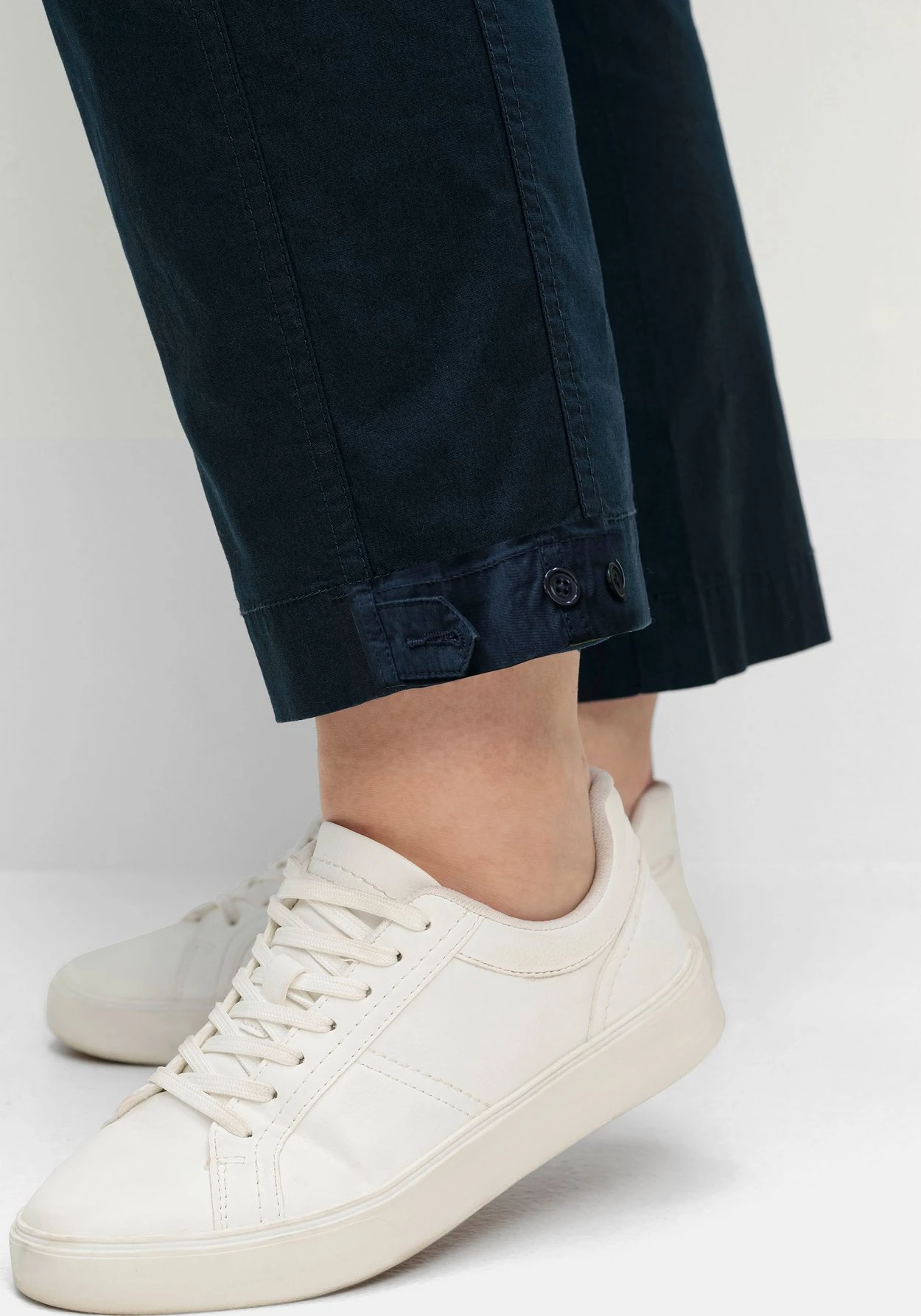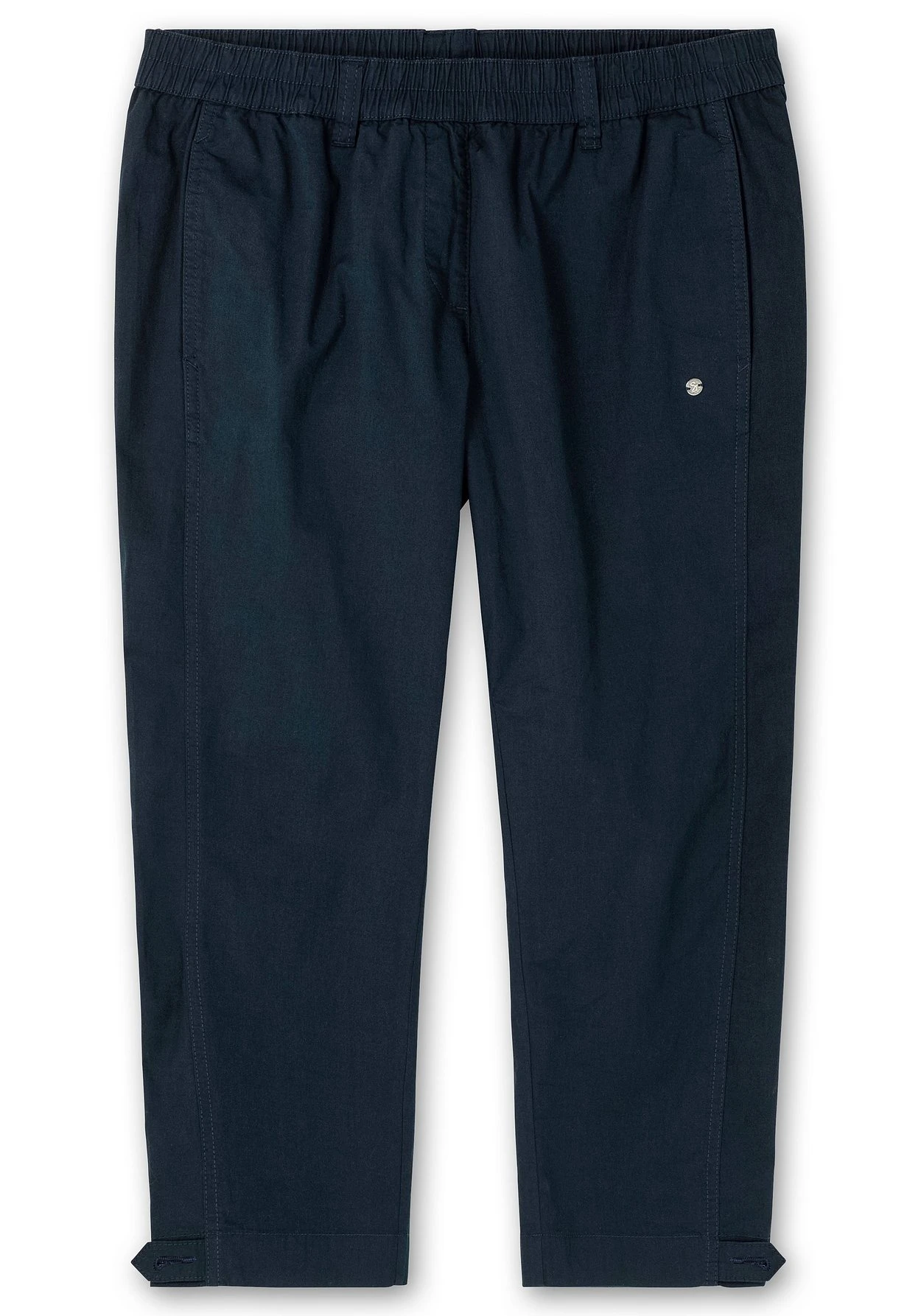 Knöchellange Hose aus leichtem Popeline. Modisch und praktisch zugleich sind Riegel und Knopf unten am Saum, mit denen sich dieser in der Weite verstellen lässt. Für einen bequemen Sitz in der Taille sorgt der Gummibund. Gürtelschlaufen und Ziernähte vorn verleihen der Hose eine gepflegte Optik. Seitliche Teilungsnähte strecken die Beine, als praktisches Finish dienen die Eingrifftaschen.