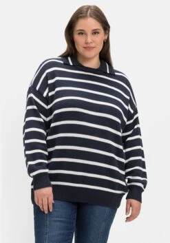 Pullover mit Streifen. Der Rundhalsausschnitt mit Polokragen unterstreicht seinen sportiven Auftritt. Dazu kommen lässig überschnittene Schultern und Rippbündchen an allen Abschlüssen.