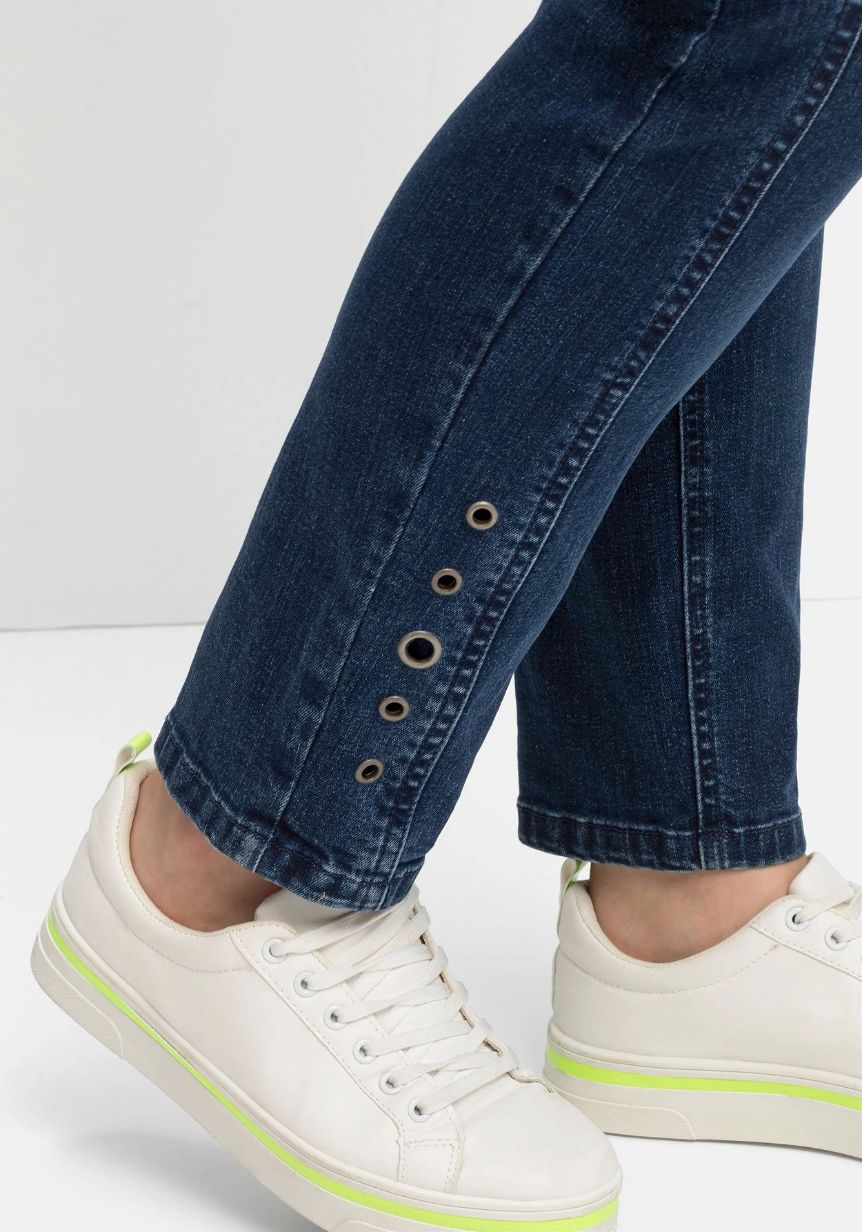 Schmale Stretch-Jeans mit modisch vorverlegter Seitennaht. Eyecatcher sind die dekorativen Ösen seitlich am Beinabschluss – diese geben dem Look eine gewisse Coolness. Ansonsten zeigt sich die Hose mit Festbund, Knopf in Metalloptik, Gürtelschlaufen und Reißverschluss. Die beiden Eingrifftaschen werden vorn durch eine mit Nieten verzierte Pockettasche ergänzt, die Gesäßtaschen sind mit Ziernähten abgesetzt. Individuelle Waschung und Catfaces geben der Jeans Modernität.