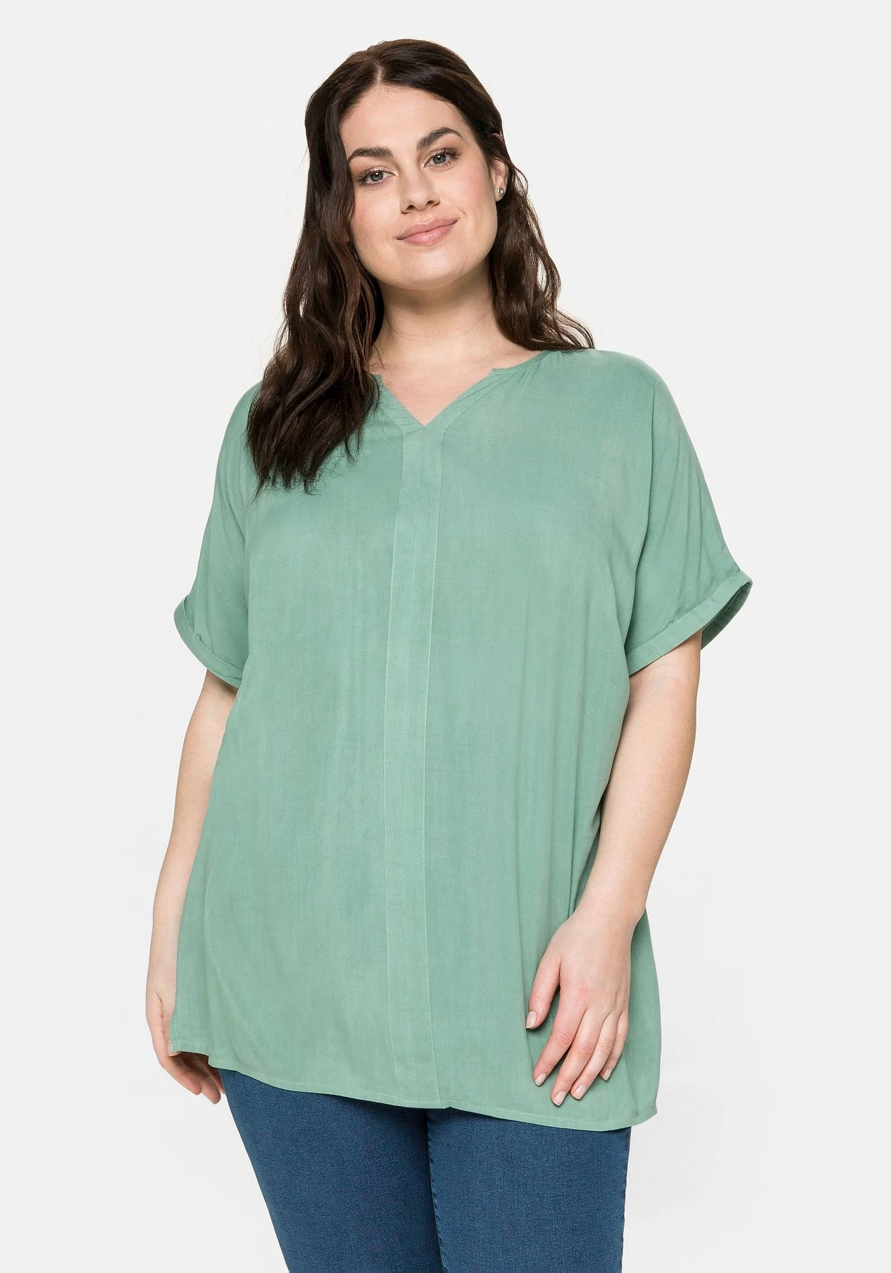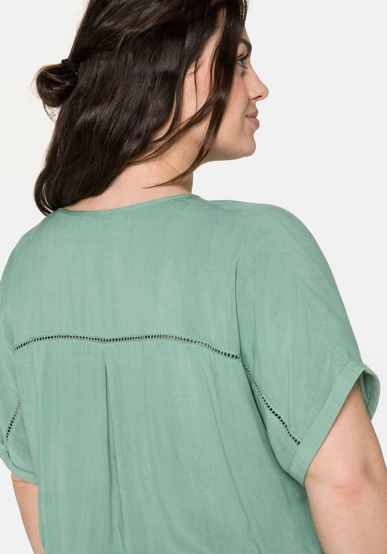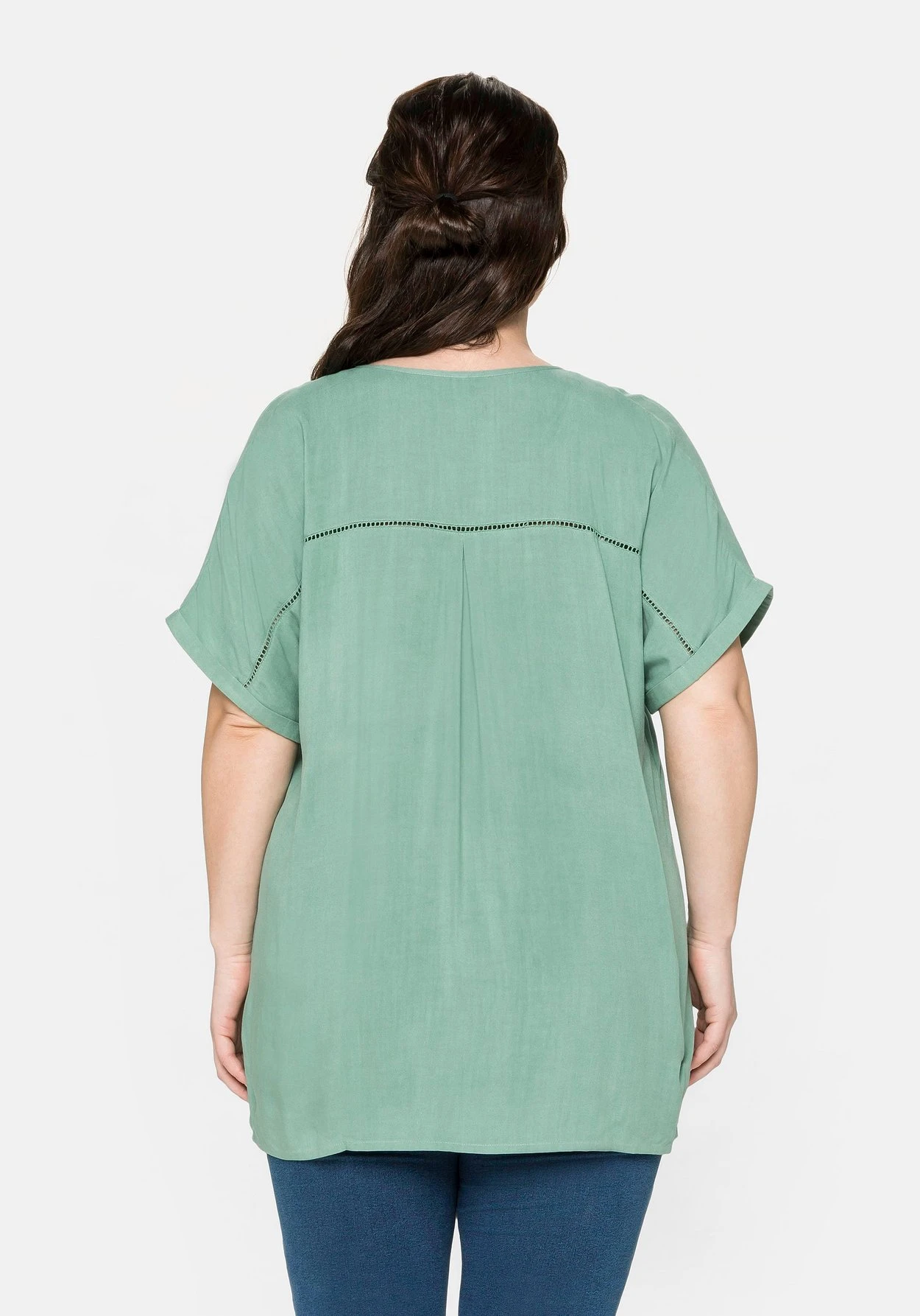Tunika mit V-Ausschnitt. Der cleane Look erhält durch dezente Details modische Spannung: Vorn fällt die mittig gesetzte Blende ins Auge, hinten überrascht das dekorative Lochstrickmuster. An den überschnittenen Schultern befinden sich kurze Ärmel mit fixierten Umschlägen, im Rücken gibt die Passe mit Kellerfalten dem Oberteil einen schönen Fall.