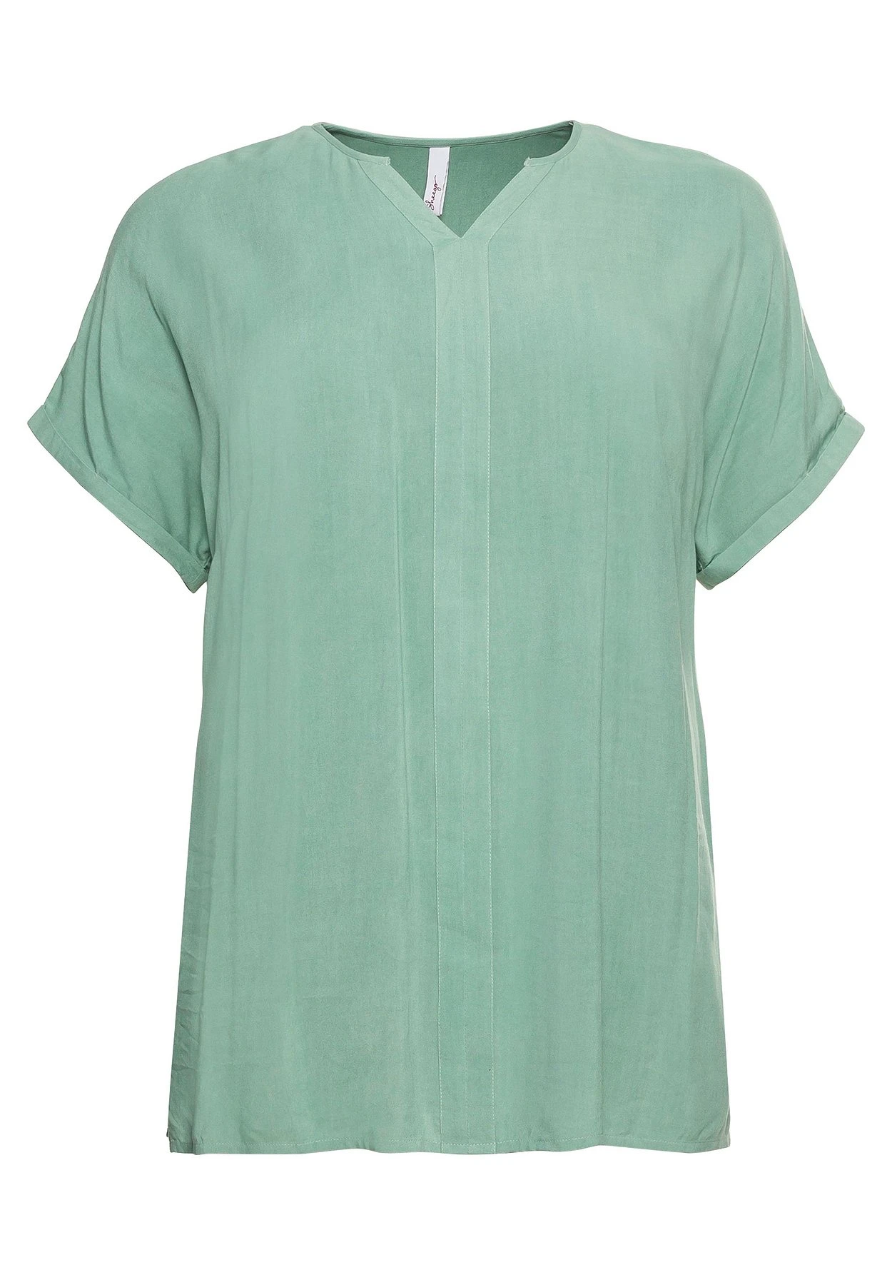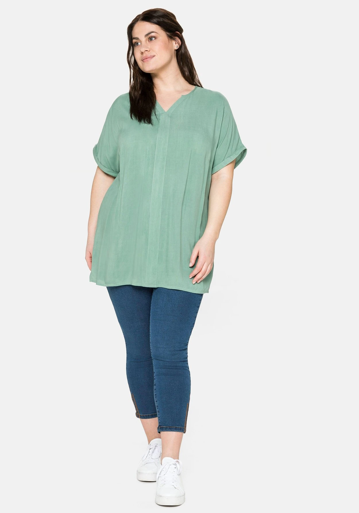 Durch den lockeren Schnitt eignet sich die Tunika für jeden Figurtyp, die Blende vorn streckt dabei optisch die Silhouette.
