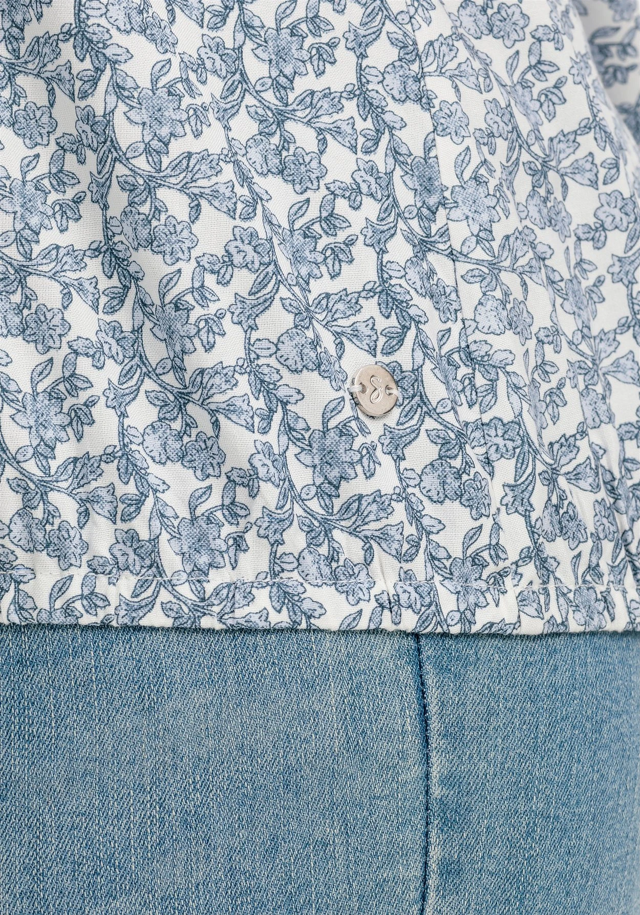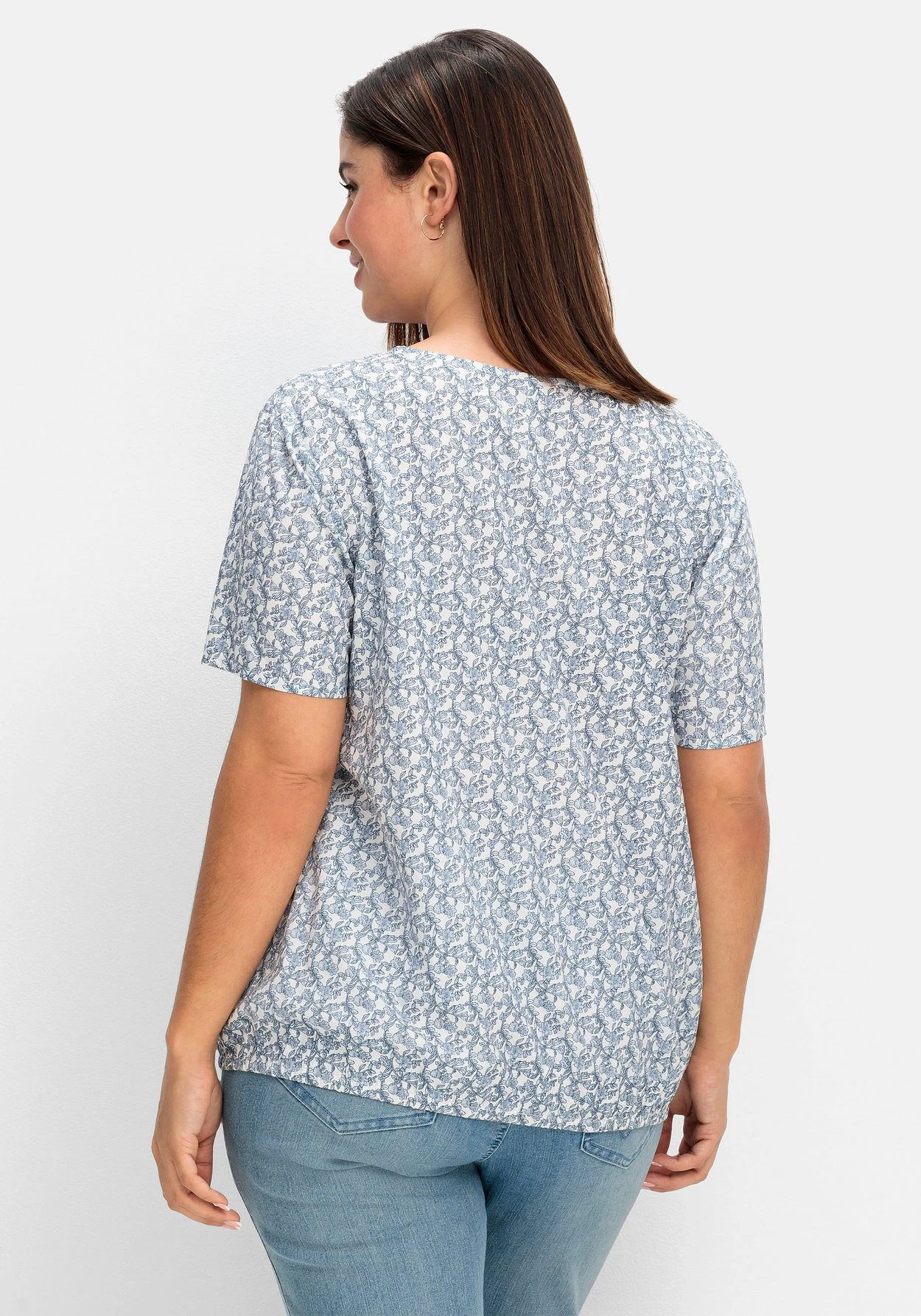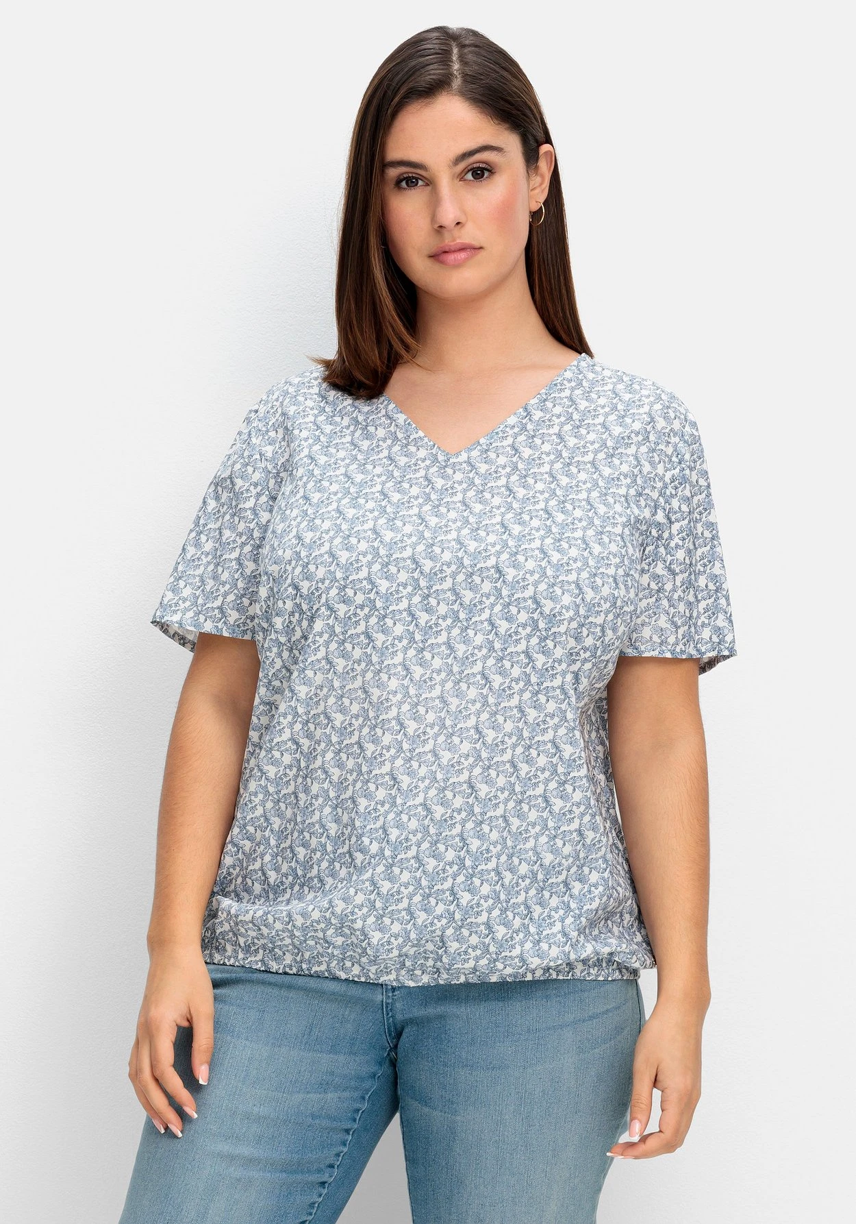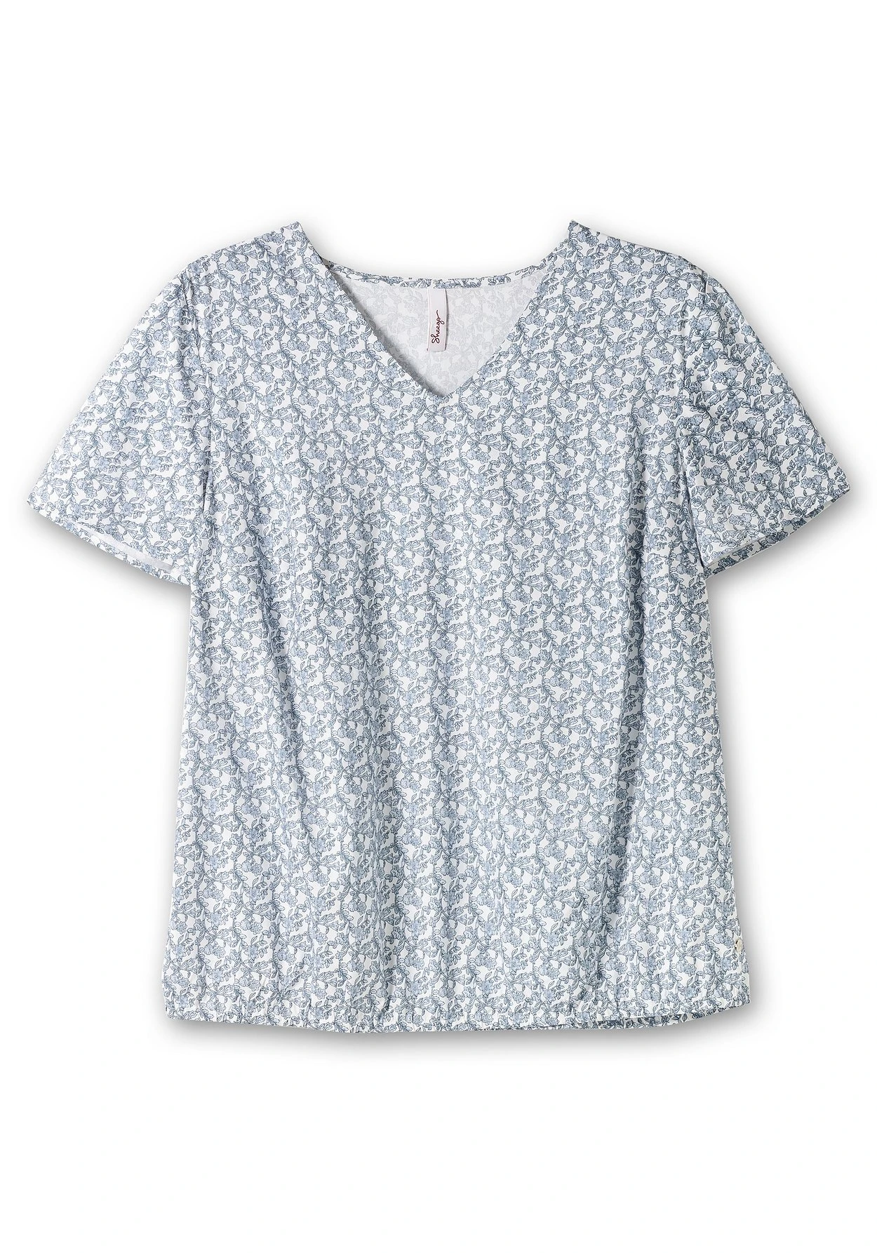 Tunika mit floralem Minimalprint. Der locker fallende Schnitt mit angenehm weitem Ärmel wird am Saum durch den Gummizugbund zusammengefasst. Ein V-Ausschnitt ergänzt feminin den Look.