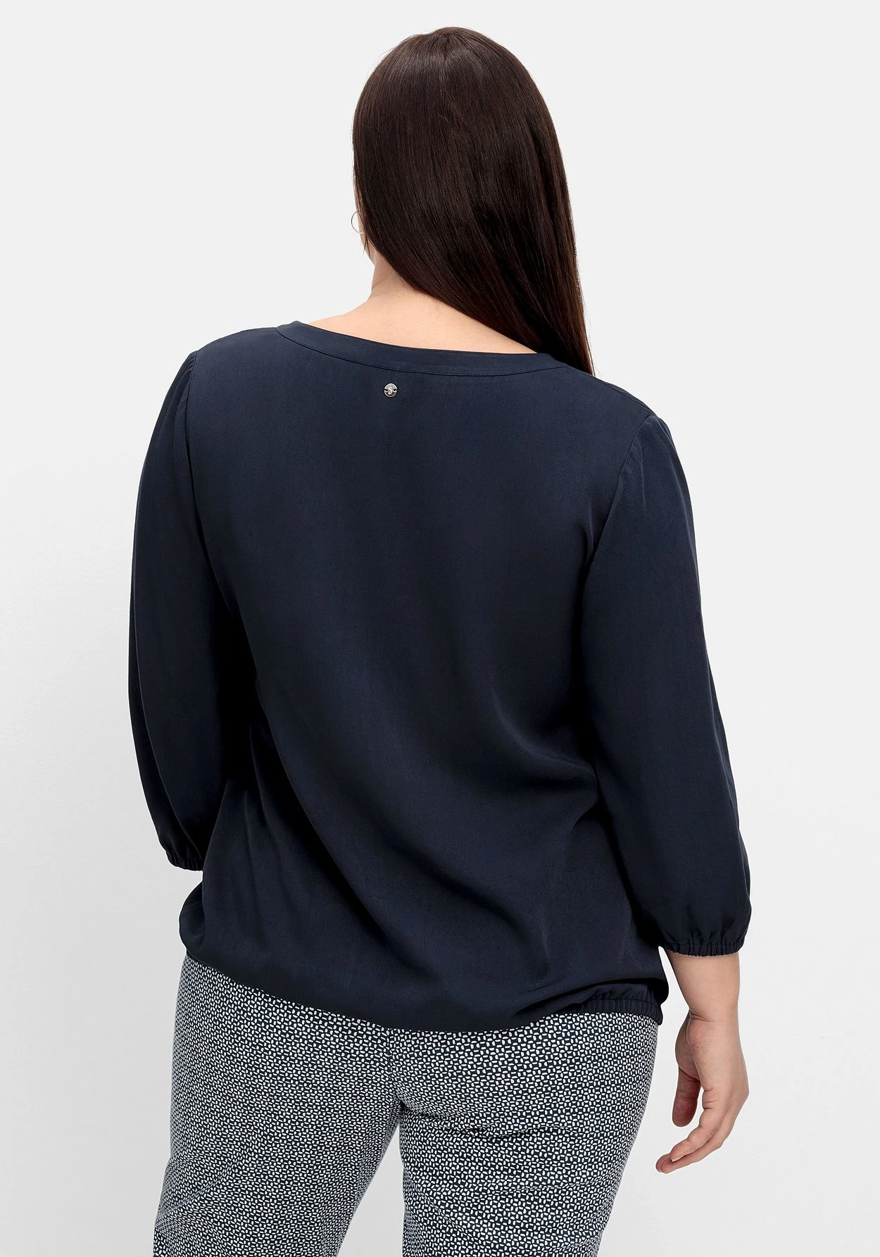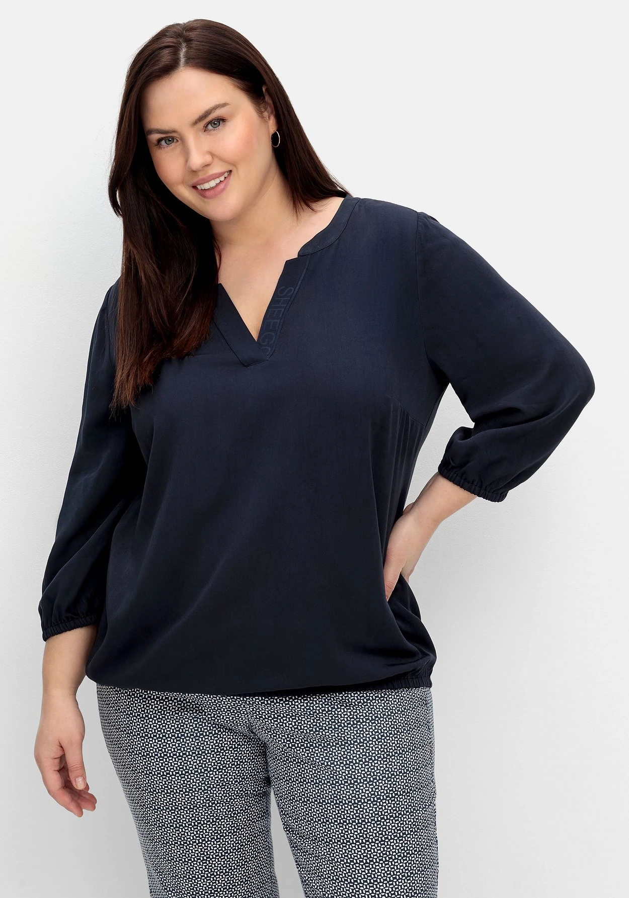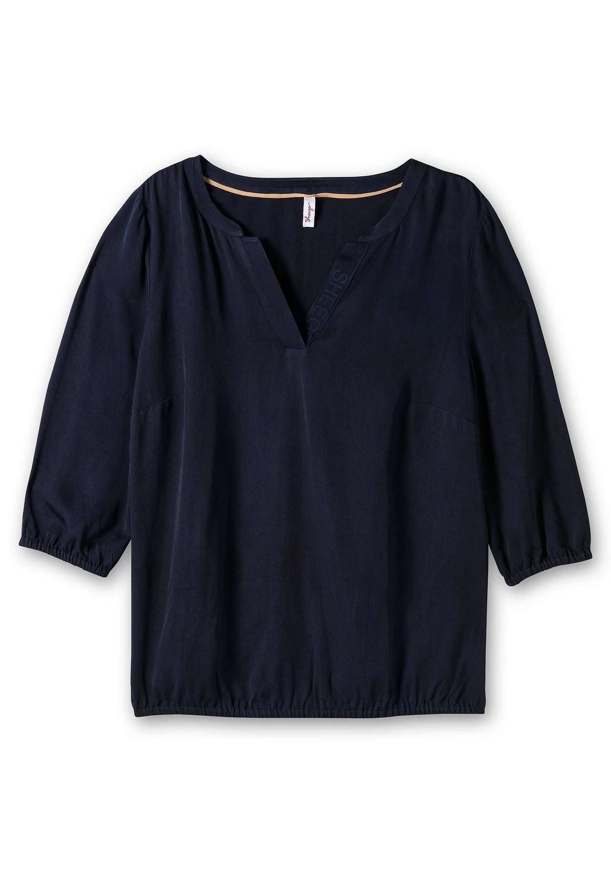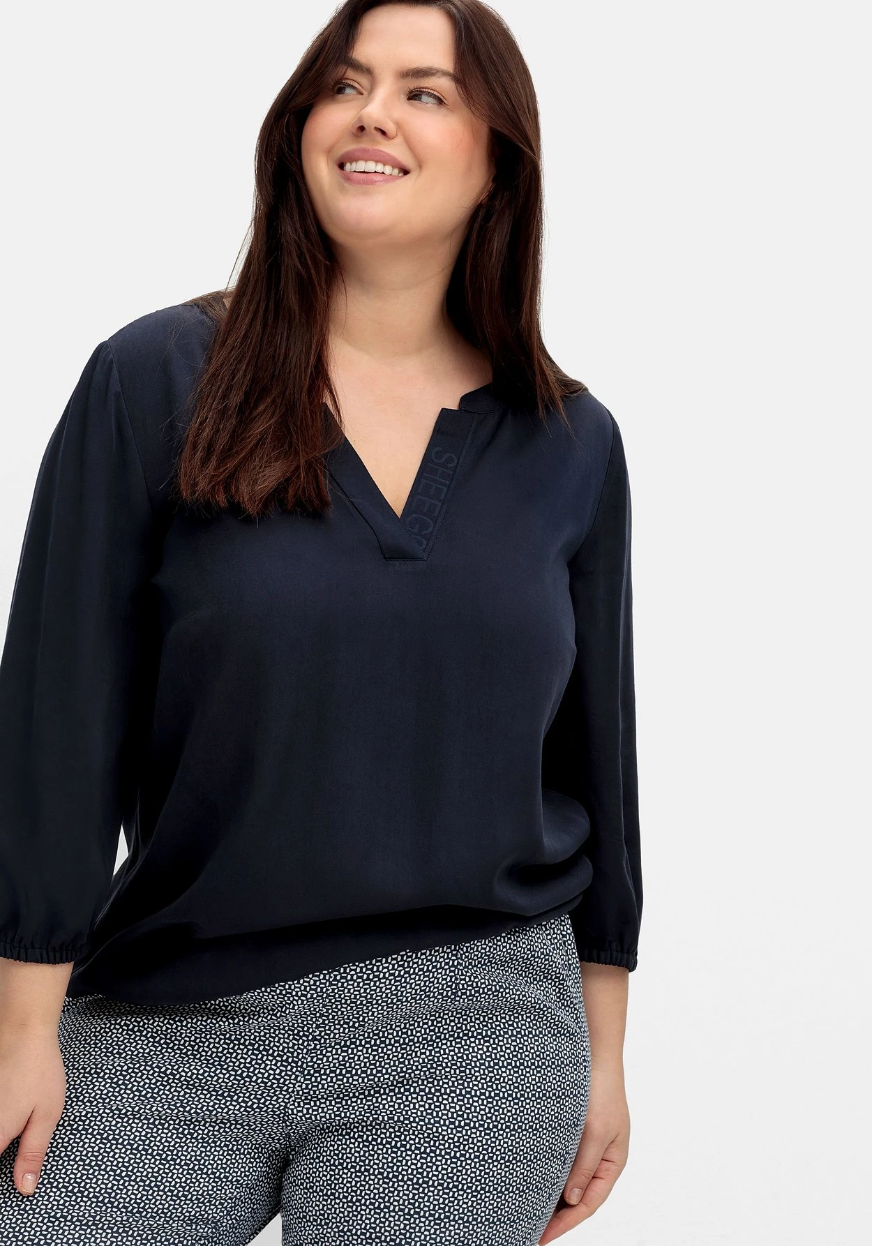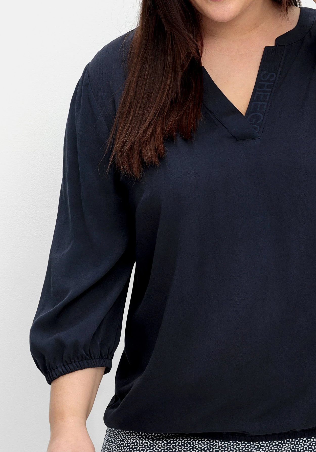 Tunika mit 3/4-Arm. Der sportive Look wird durch die Gummizugbündchen an 3/4-Arm und Saum geprägt. Der Rundhalsausschnitt geht in einen V-Schlitz über, an der Seite fällt der tonige sheego Wordingprint dezent ins Auge.