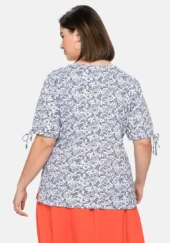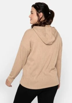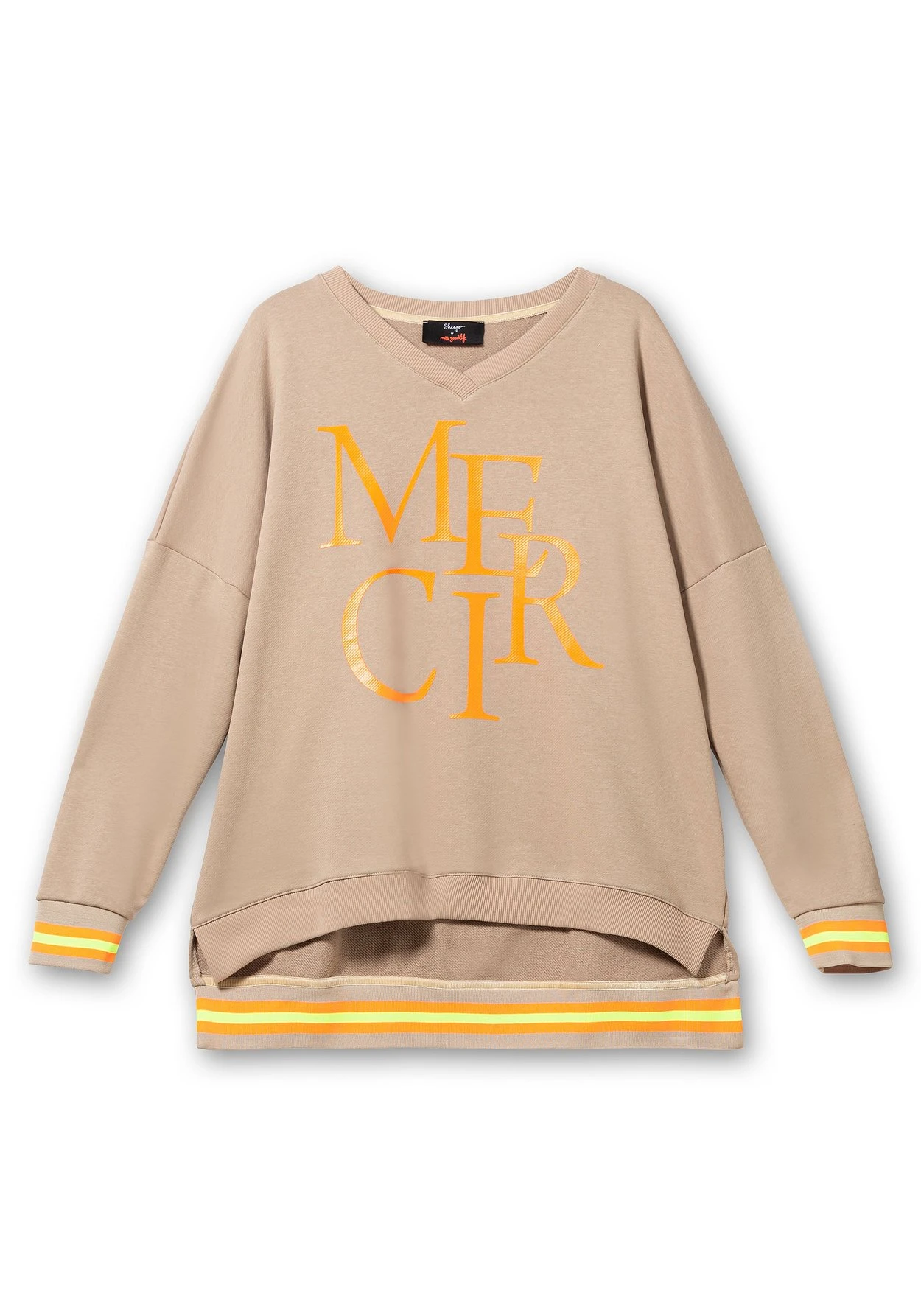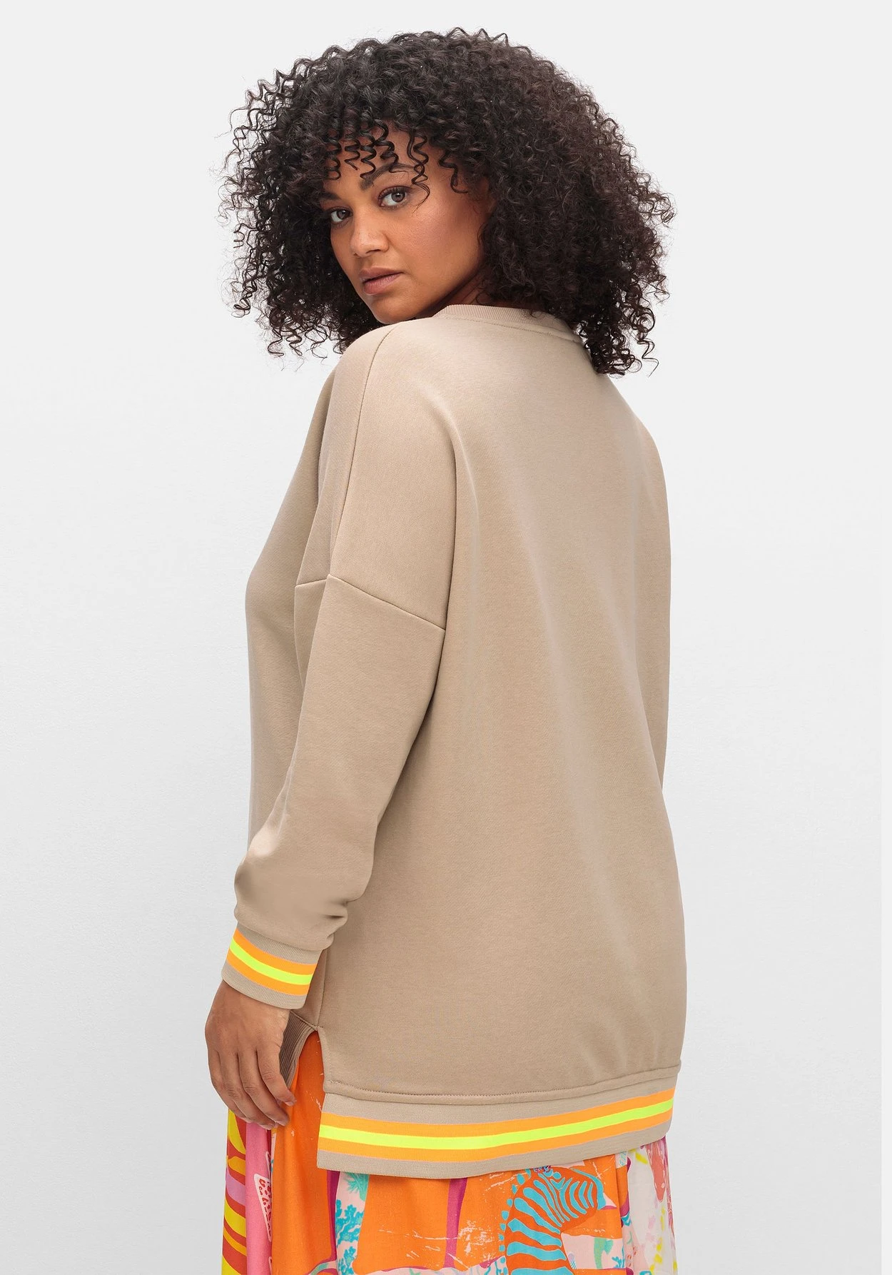 Sweatshirt mit geripptem V-Ausschnitt von sheego loves miss goodlife. Durch den großflächigen, farbigen Wordingprint im Vorderteil wird der Sweater zum Hingucker und setzt gleichzeitig ein klares Statement. Auch die breiten geringelten Bündchen am Ärmelabschluss und hinteren Saum setzen sich sportiv ab. Überschnittene Schultern, der etwas längere Rücken und die seitlichen Schlitze im Saum unterstreichen den lässigen Charakter.