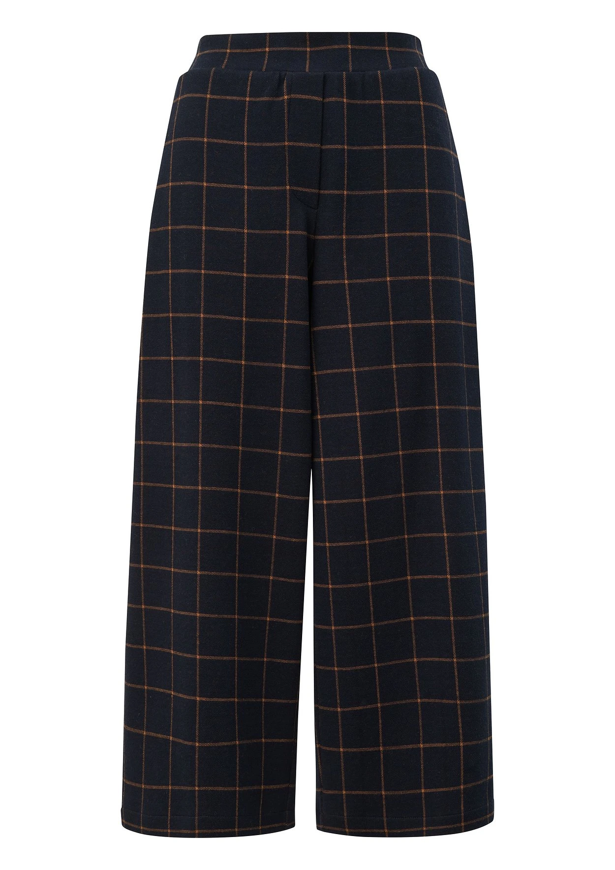 Charakteristisch für die modische und zugleich bequeme Culotteform ist das weite Bein in 7/8-Länge. Der hohe Bund betont die Taille.