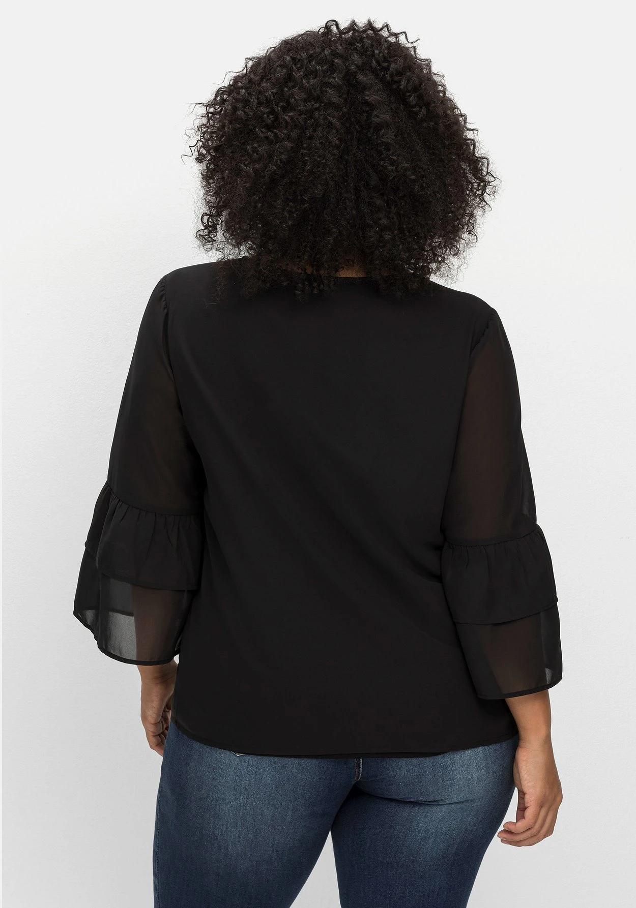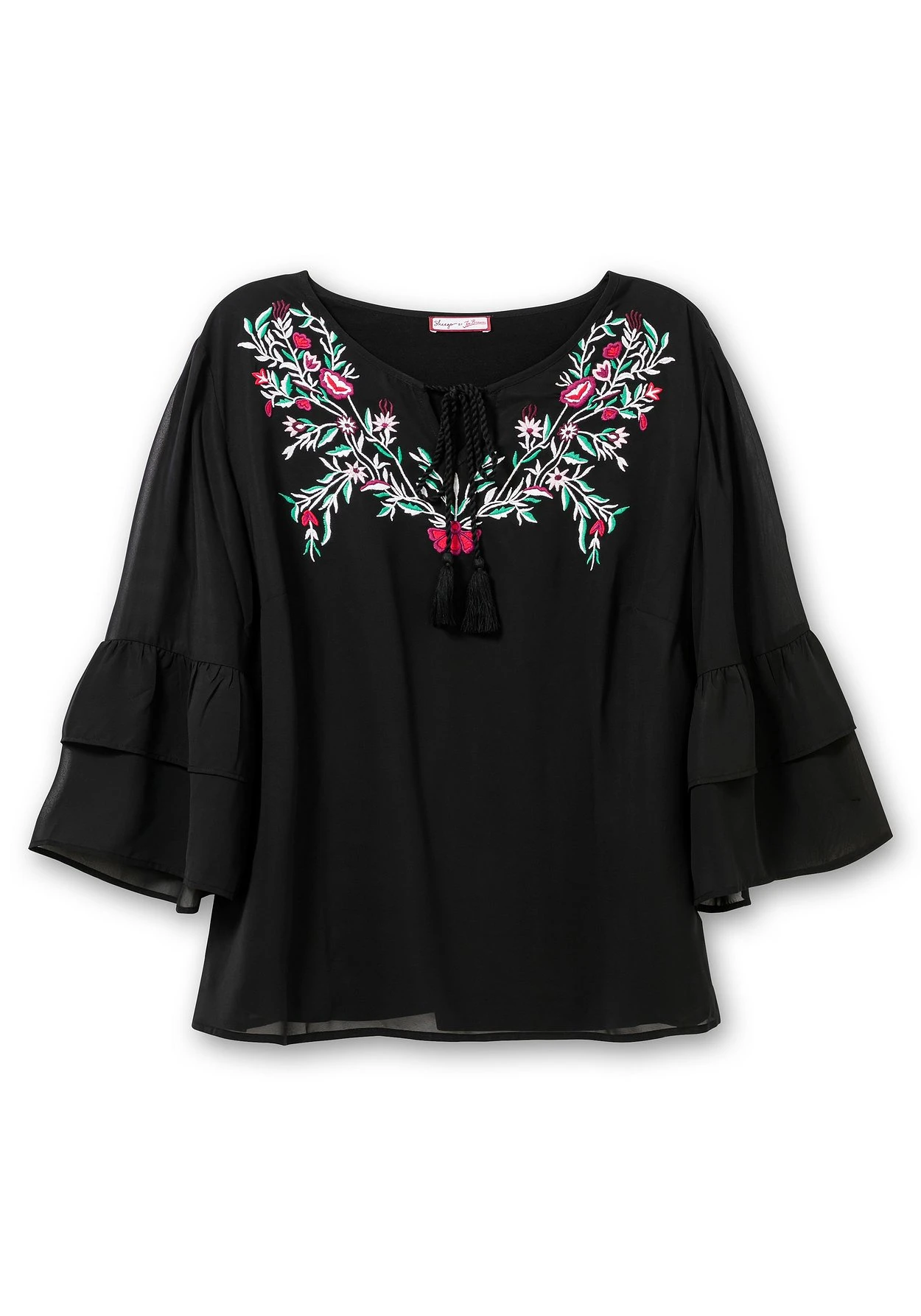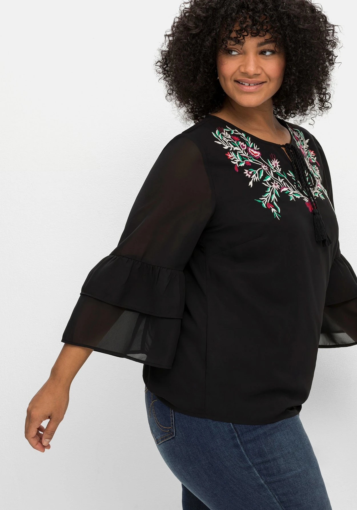 Chiffontunika in Double-Layer-Optik von sheego by Joe Browns. Herzstück des Looks ist die florale Stickerei im Vorderteil. Auch der geschlitzte Rundhalsausschnitt mit Bindeband und Quasten unterstreicht den romantischen Boho-Stil. Die 3/4-langen Rüschenärmel sind dazu eine charmante Ergänzung.